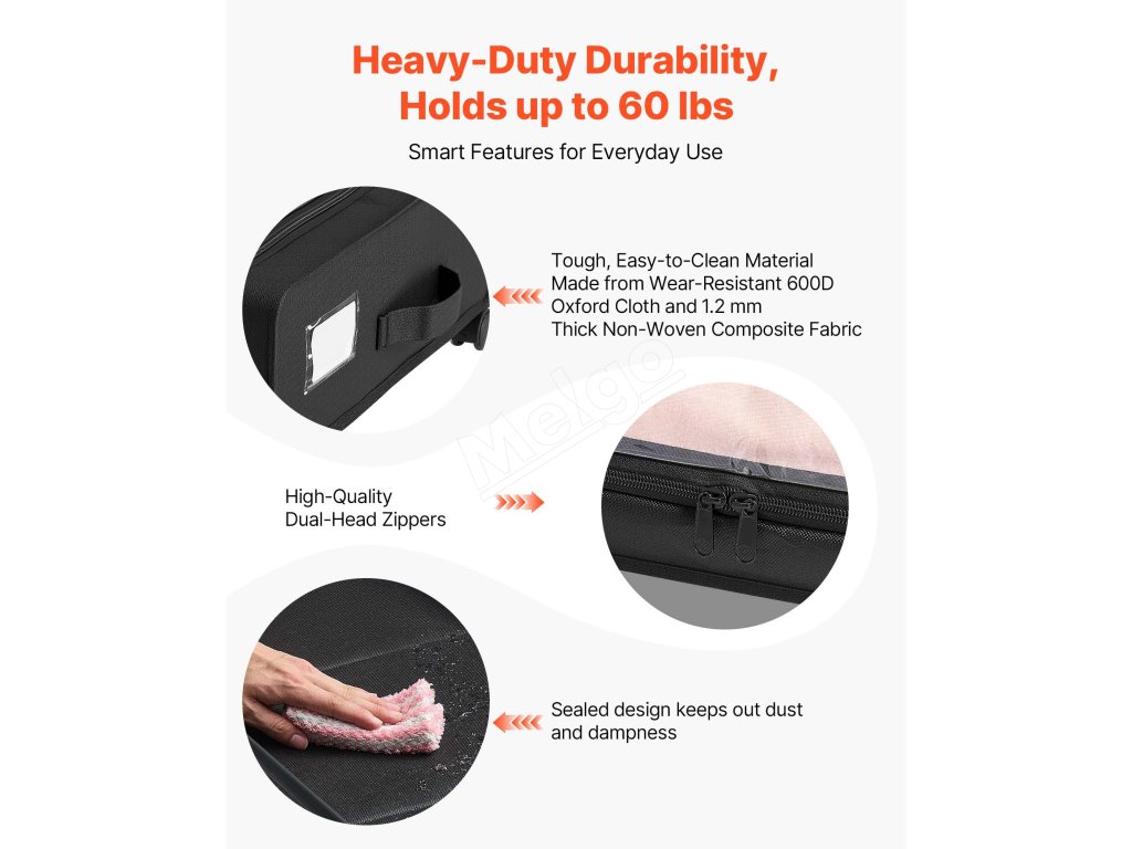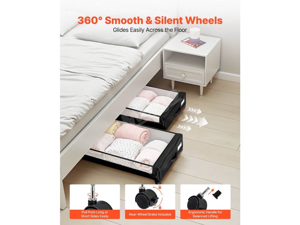 Tento rolovací úložný priestor pod posteľ je vybavený bočnou rukoväťou a štyrmi kolieskami s plynulým otáčaním o 360° (niektoré s aretáciou), vďaka čomu ľahko kĺže po rôznych povrchoch a umožňuje bezpečné umiestnenie.