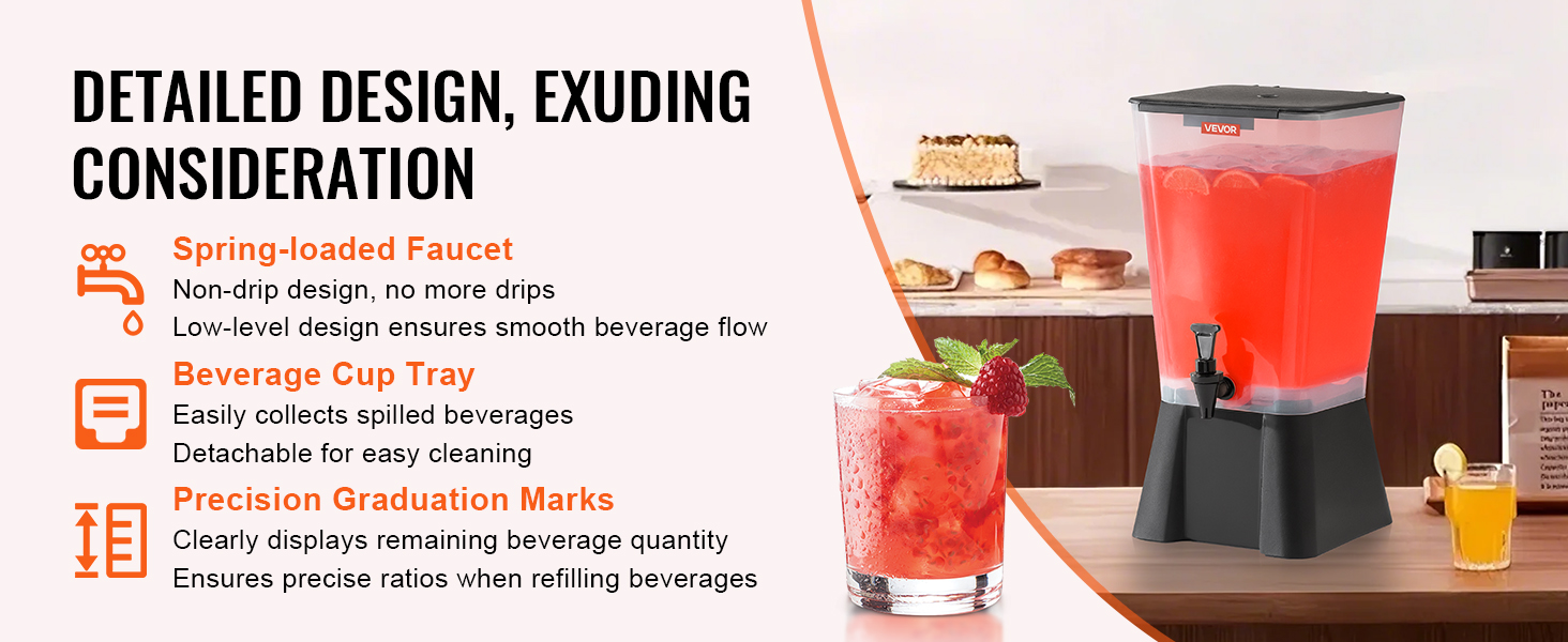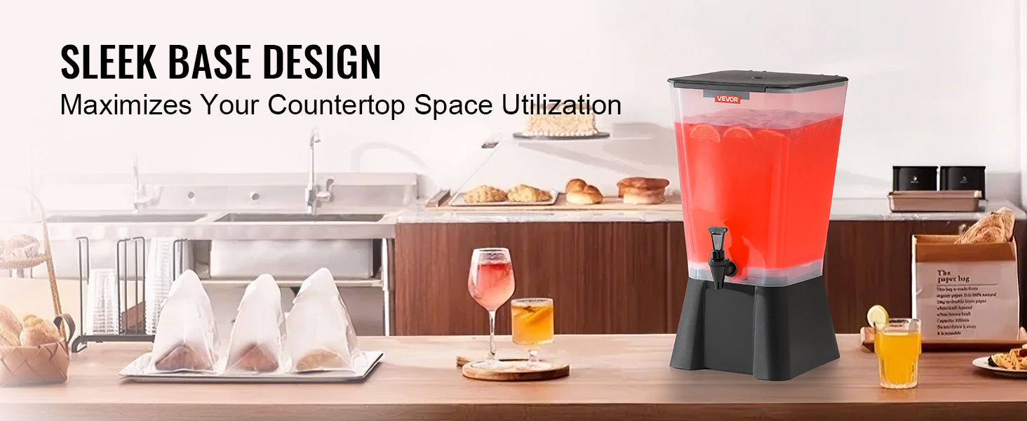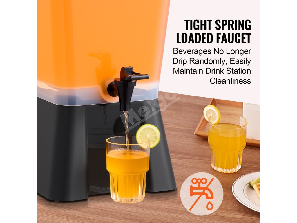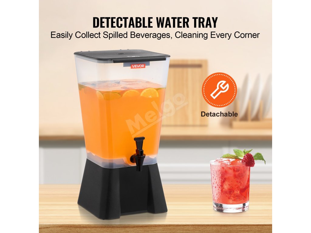 Výdajník džúsov je vyrobený z potravinárskeho materiálu PP, je odolný voči škvrnám, trvácny a vhodný do umývačky riadu. Ideálny na ľadový čaj, džús alebo vodu.