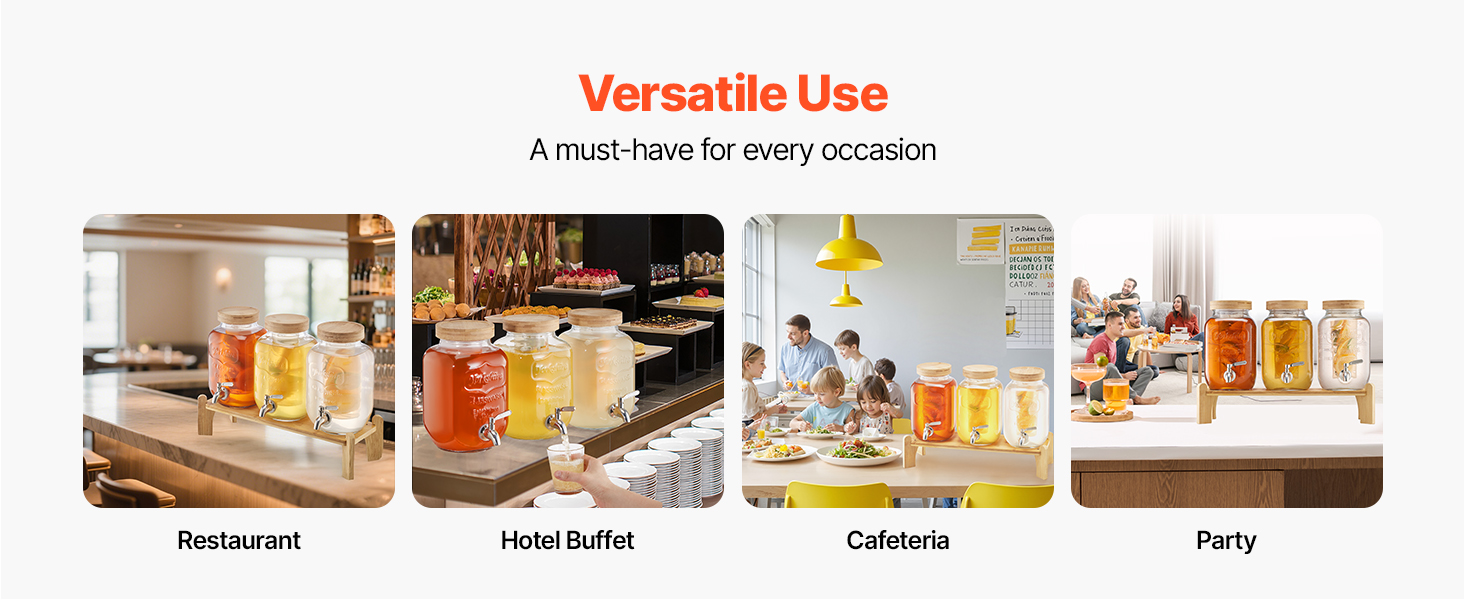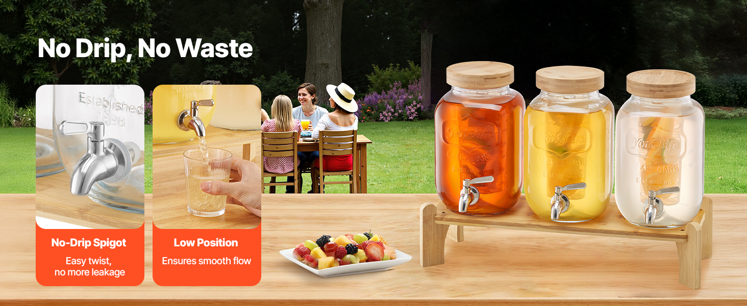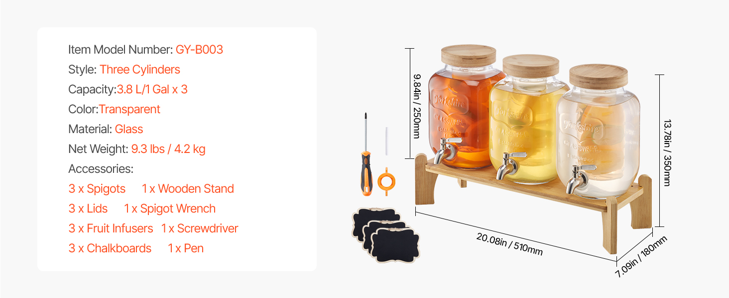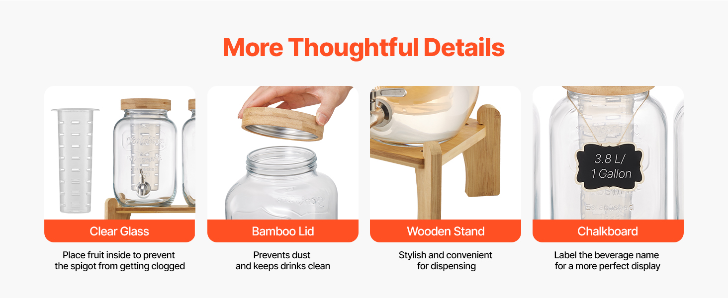 Priehľadný sklenený valec prehľadne zobrazuje hladinu nápoja, zatiaľ čo dizajn so širokým hrdlom uľahčuje dopĺňanie. Veko zabraňuje tvorbe prachu, stojan poskytuje stabilnú oporu a jednoduché dávkovanie a malé kriedové tabuľky sú ideálne na označovanie názvov nápojov.