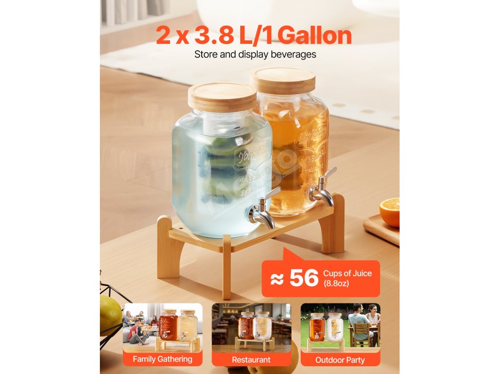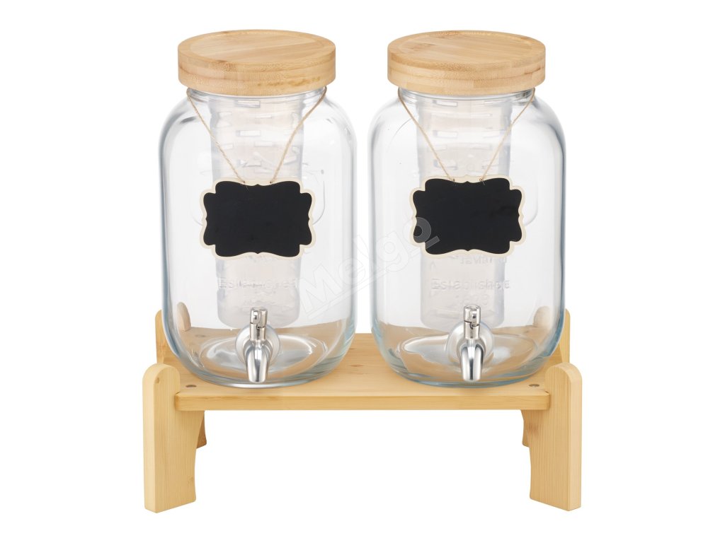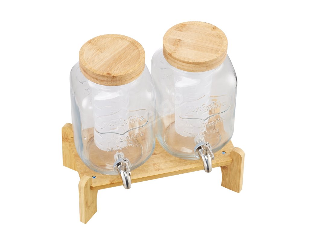 Sklenený dávkovač nápojov 2×3.8l s dreveným stojanom, nerezový kohútik
