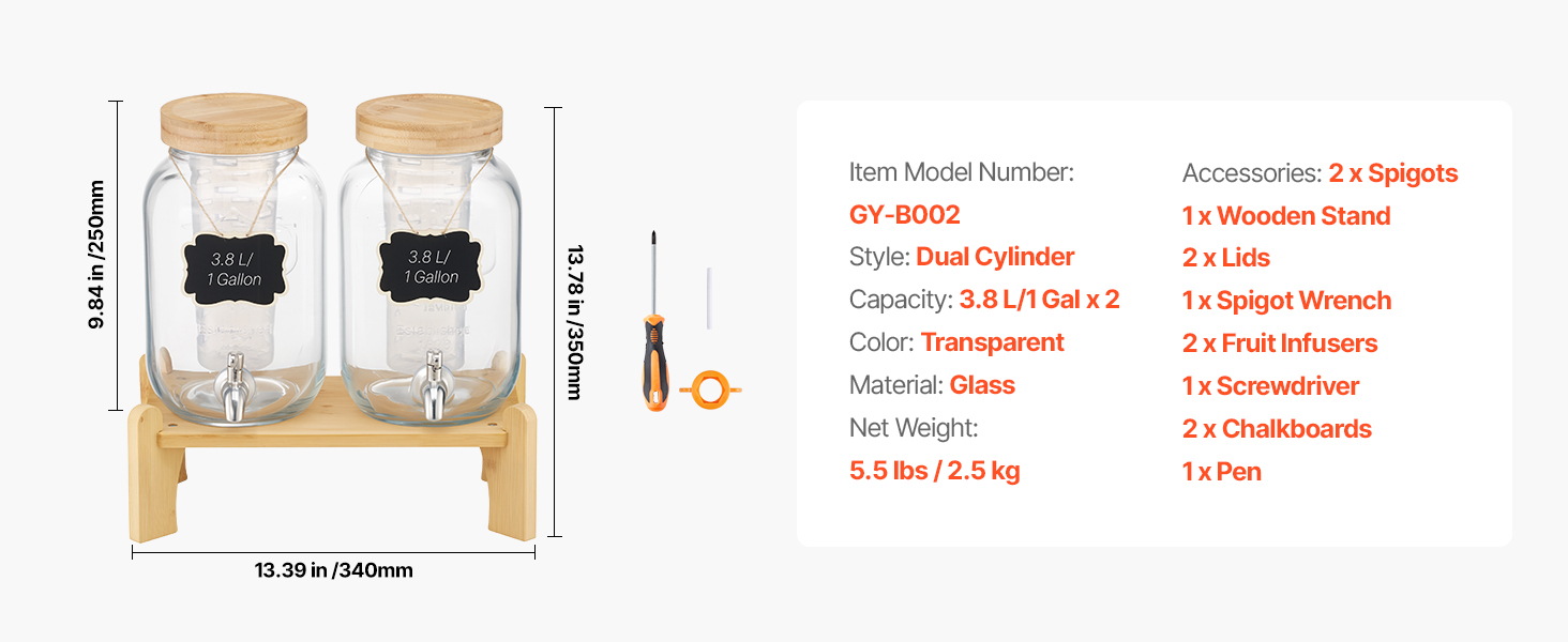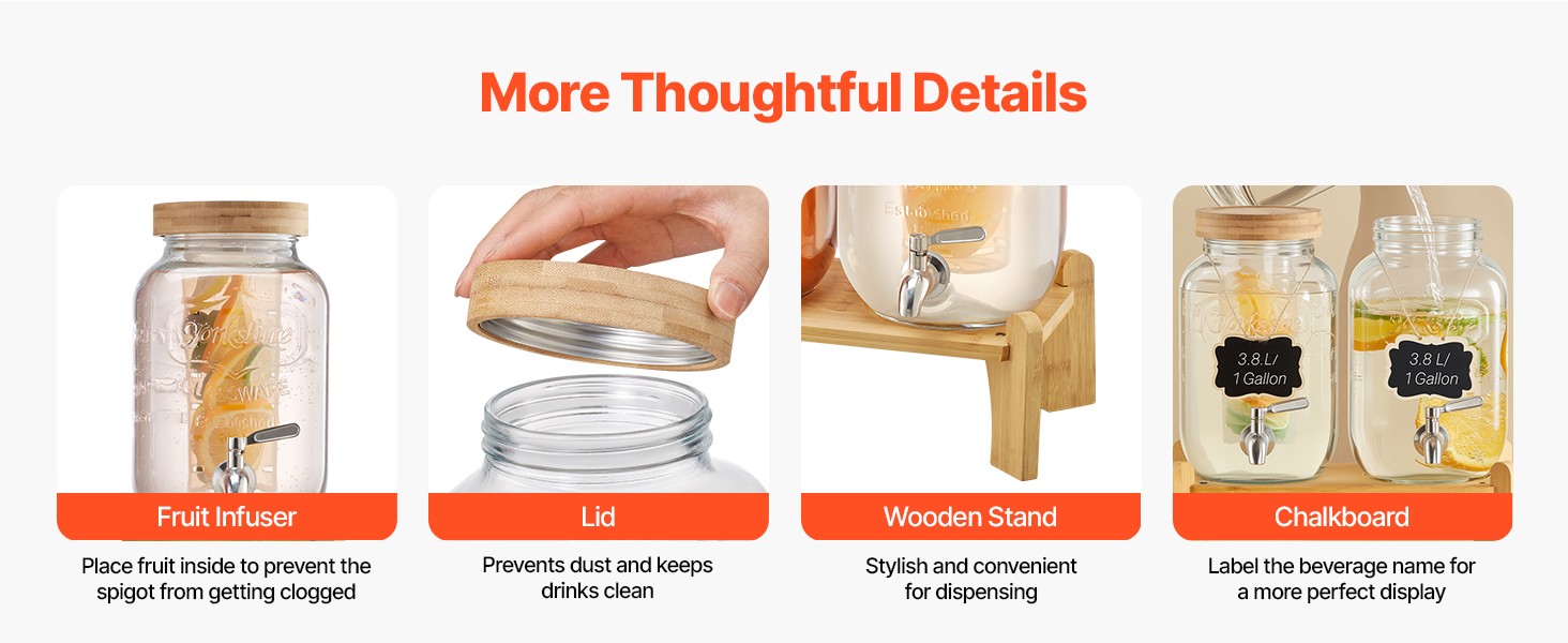Priehľadný sklenený valec prehľadne zobrazuje hladinu nápoja, zatiaľ čo dizajn so širokým hrdlom uľahčuje dopĺňanie. Veko zabraňuje tvorbe prachu, stojan poskytuje stabilnú oporu a jednoduché dávkovanie a malé kriedové tabuľky sú ideálne na označovanie názvov nápojov.