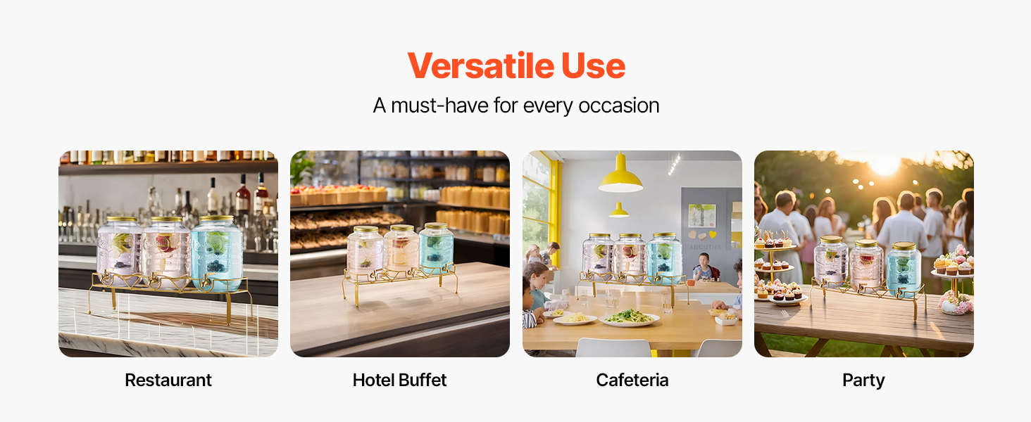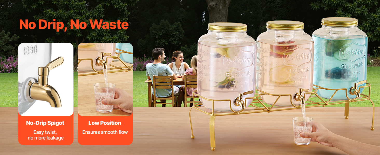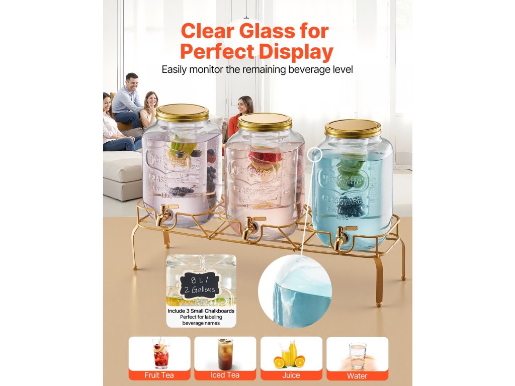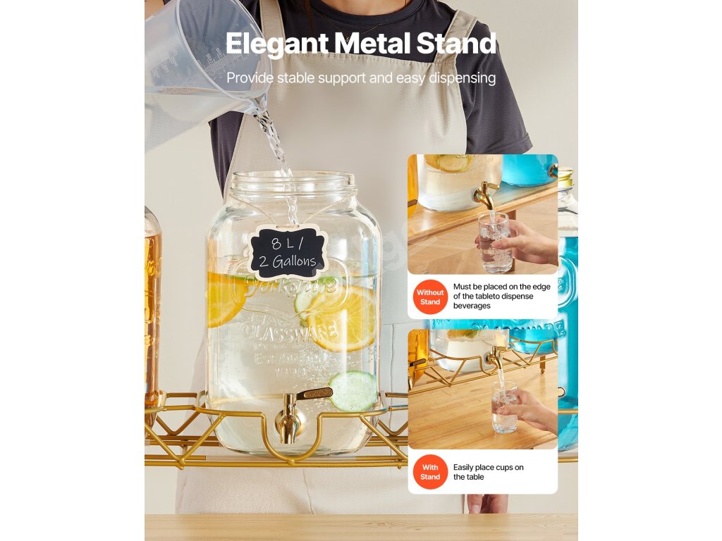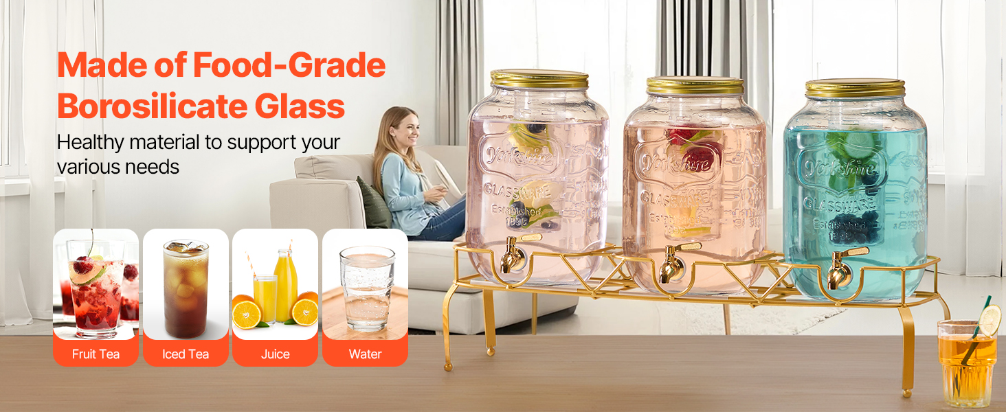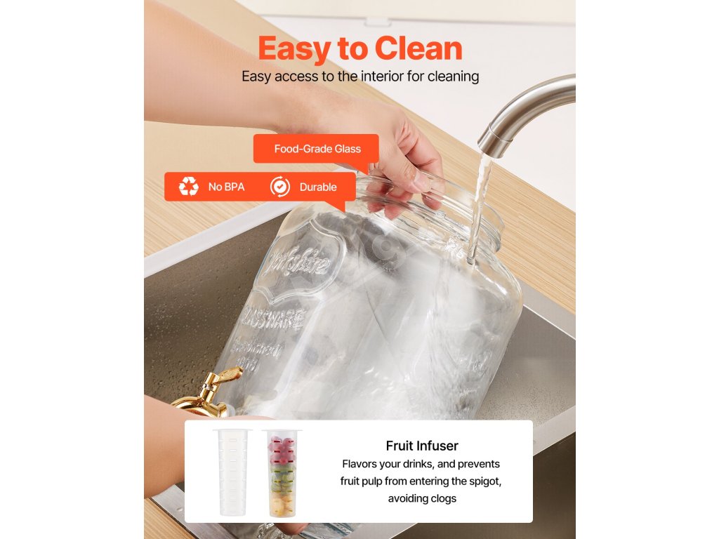 Výdajník džúsov je vyrobený z potravinárskeho skla, je odolný voči škvrnám, trvácny a vhodný do umývačky riadu. Ideálny na ľadový čaj, džús alebo vodu.