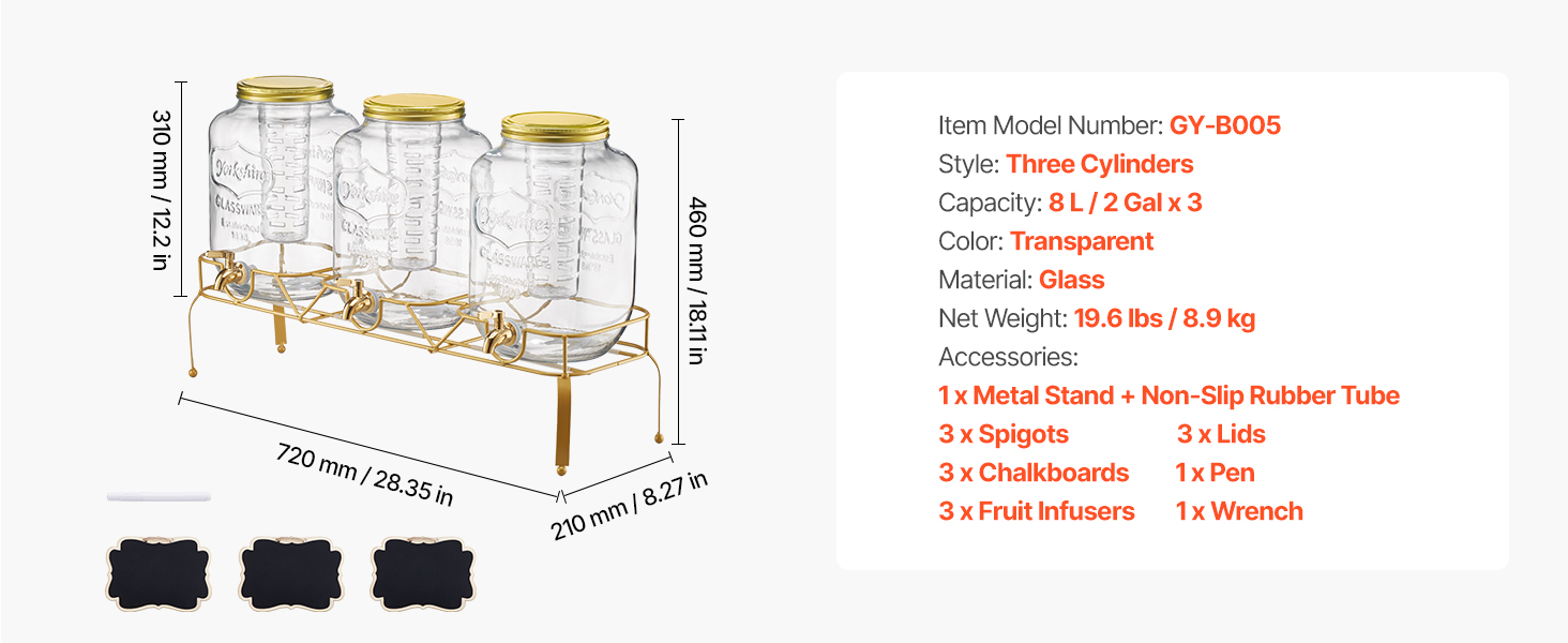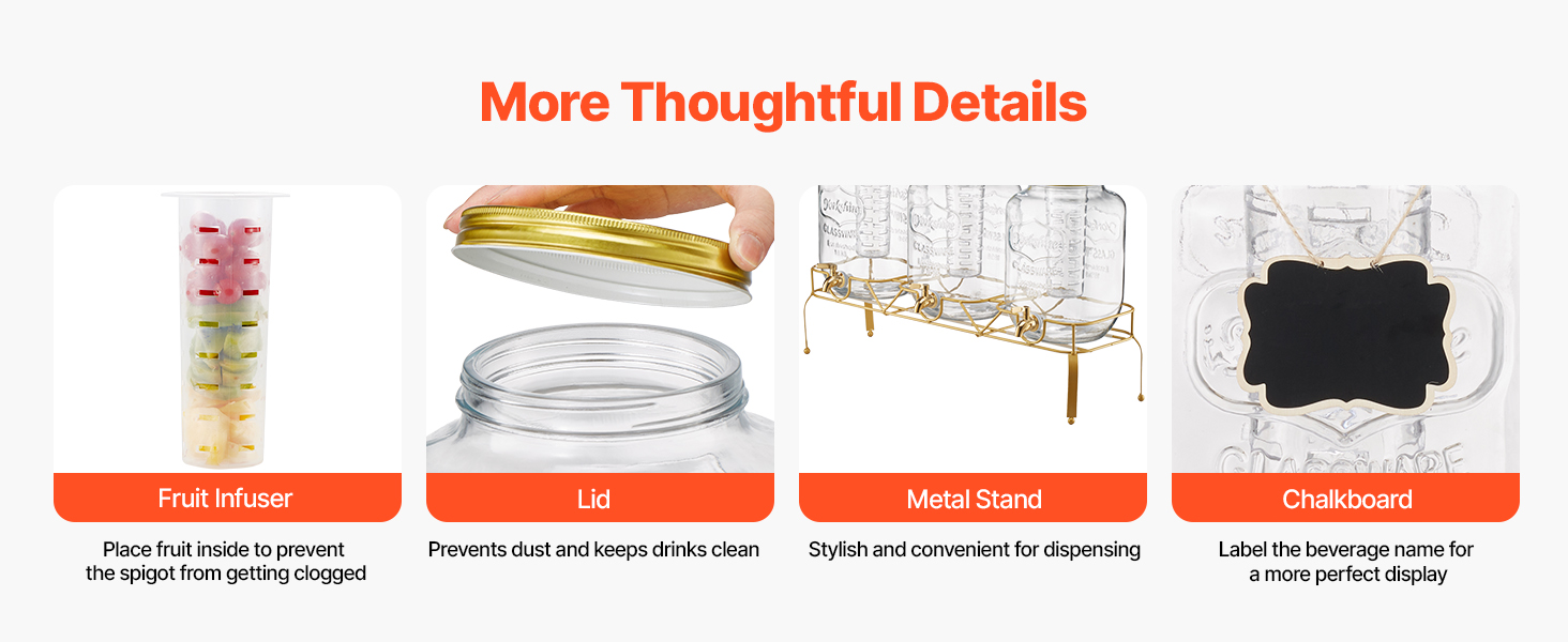 Priehľadný sklenený valec prehľadne zobrazuje hladinu nápoja, zatiaľ čo dizajn so širokým hrdlom uľahčuje dopĺňanie. Veko zabraňuje tvorbe prachu, stojan poskytuje stabilnú oporu a jednoduché dávkovanie a malé kriedové tabuľky sú ideálne na označovanie názvov nápojov.