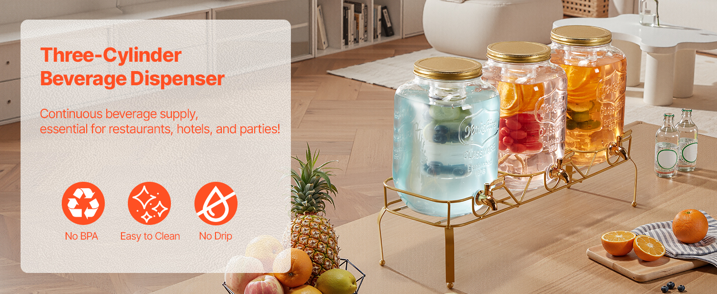 Tento dávkovač nápojov má celkovú kapacitu 24 l / 6 galónov (8 l / 2 galóny na fľašu). Konštrukcia s tromi valcami umožňuje podávať tri rôzne nápoje, čím sa zabezpečí nepretržitý prísun nápojov.