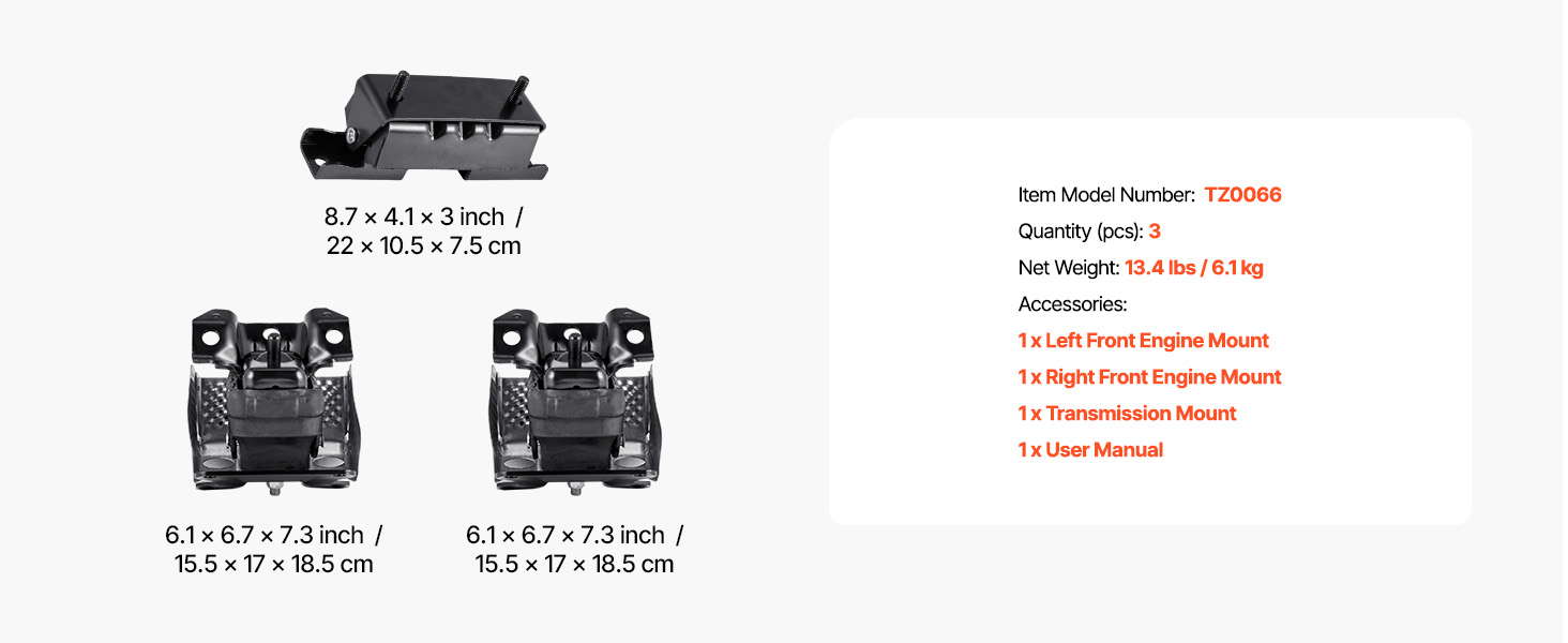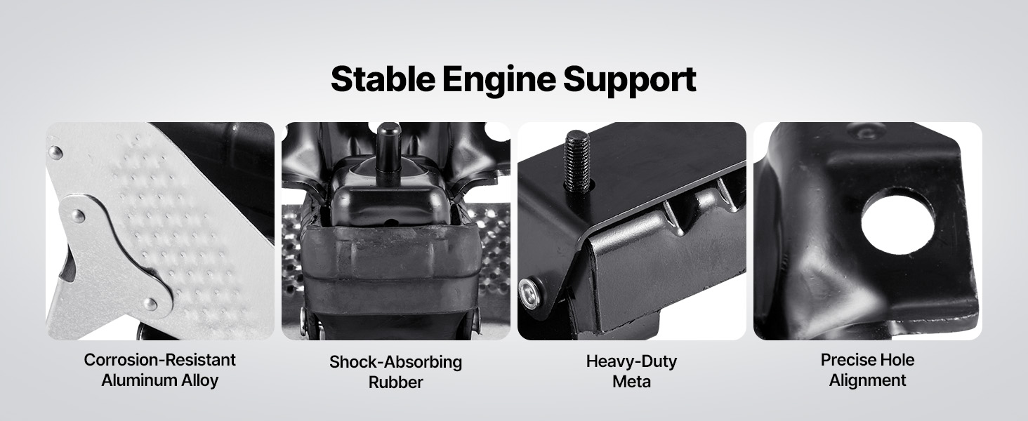 Táto súprava na uchytenie motora je presne navrhnutá tak, aby zodpovedala pôvodným rozmerom vozidla, s presným umiestnením otvorov. Je vyrobená z robustného kovu a gumy a poskytuje spoľahlivú náhradu držiaka motora, ktorá absorbuje nárazy a znižuje hluk, čím udržiava váš motor v bezpečí a chránený.