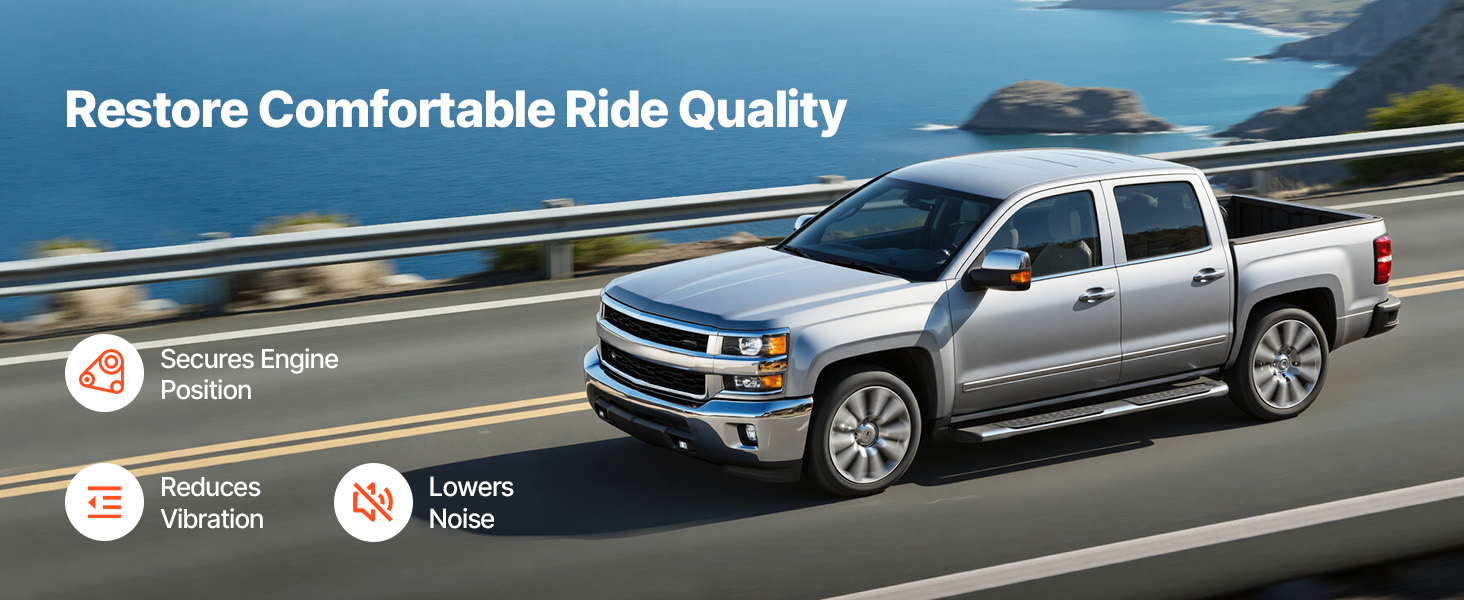 Včasná výmena opotrebovaných dielov pomocou tejto montážnej sady motora obnovuje plynulú jazdu. Udržuje motor pevne na mieste, zabraňuje chveniu počas prevádzky a pohlcuje energiu vibrácií, čím znižuje hluk prenášaný do kabíny pre väčší komfort.