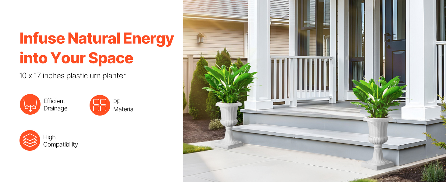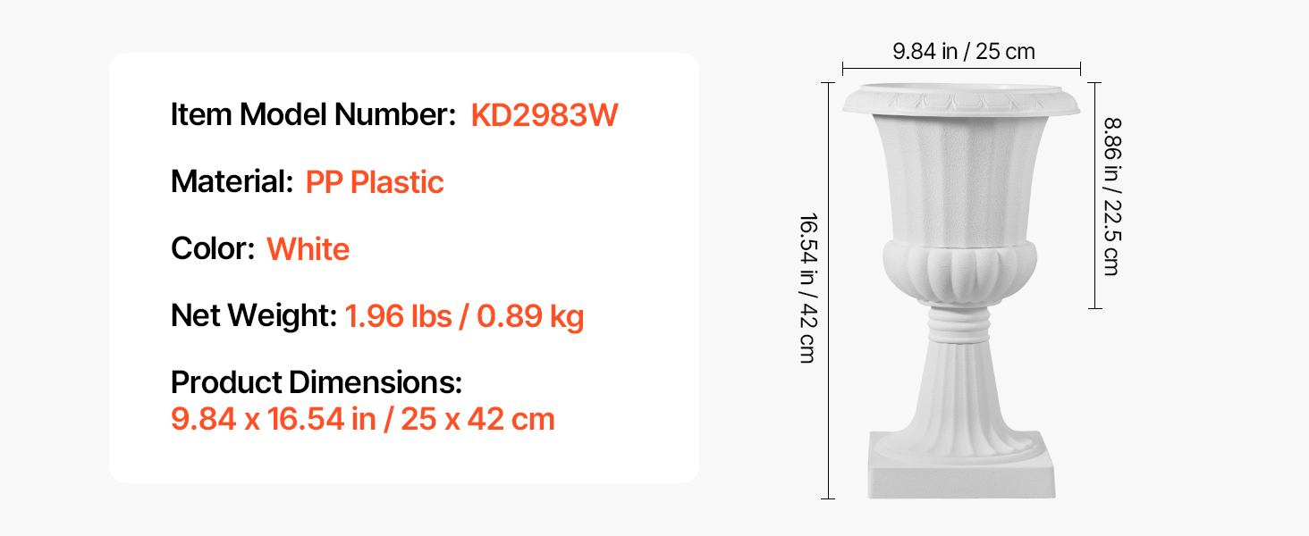 Plastová urna s rozmermi 9,8 x 16,5 palca sa dokonale hodí na rôzne rastliny. Je vyrobený z odolného PP materiálu, je ľahký a má inteligentný drenážny systém, ideálny na použitie v interiéri alebo exteriéri, aby dodal vášmu priestoru nádych prírody.