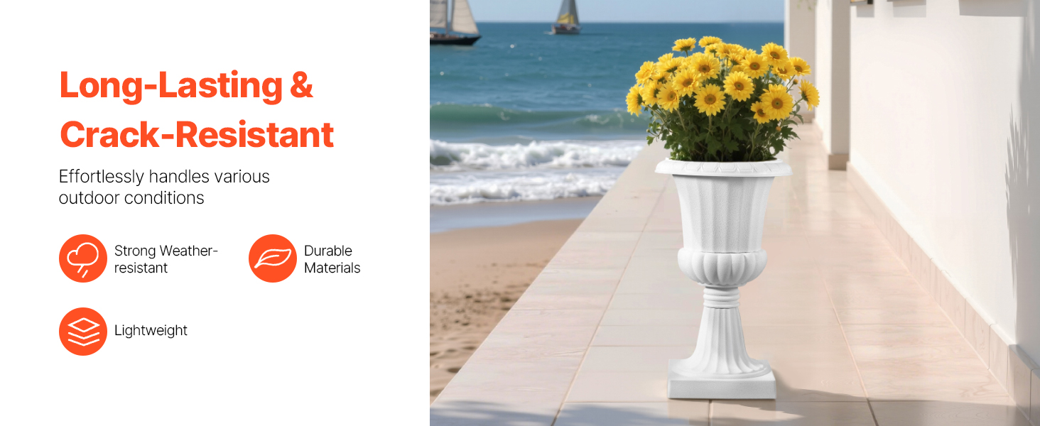 Tento podstavcový kvetináč je vyrobený z vysokokvalitných materiálov, je ľahký, odolný proti prasknutiu a navrhnutý tak, aby odolal nepriaznivým poveternostným podmienkam. Či už je slnečno alebo prší, zostane v skvelej kondícii celé roky.