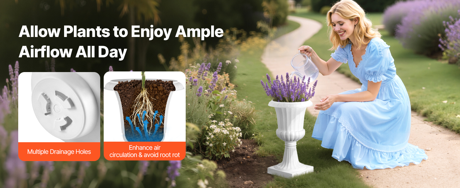 Vďaka viacerým drenážnym otvorom táto kvetinová urna podporuje cirkuláciu vzduchu a rýchly odtok vody, čím udržiava korene vašich rastlín svieže a zdravé po celý deň, a pomáha im tak prosperovať.