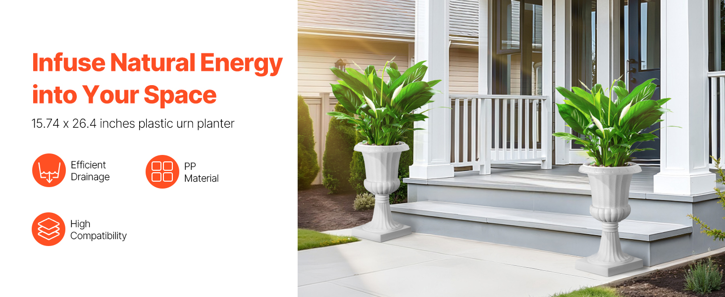 Plastová urna s rozmermi 15,8 x 26,4 palca sa dokonale hodí na pestovanie rôznych rastlín. Je vyrobený z odolného PP materiálu, je ľahký a má inteligentný drenážny systém, ideálny na použitie v interiéri alebo exteriéri, aby dodal vášmu priestoru nádych prírody.