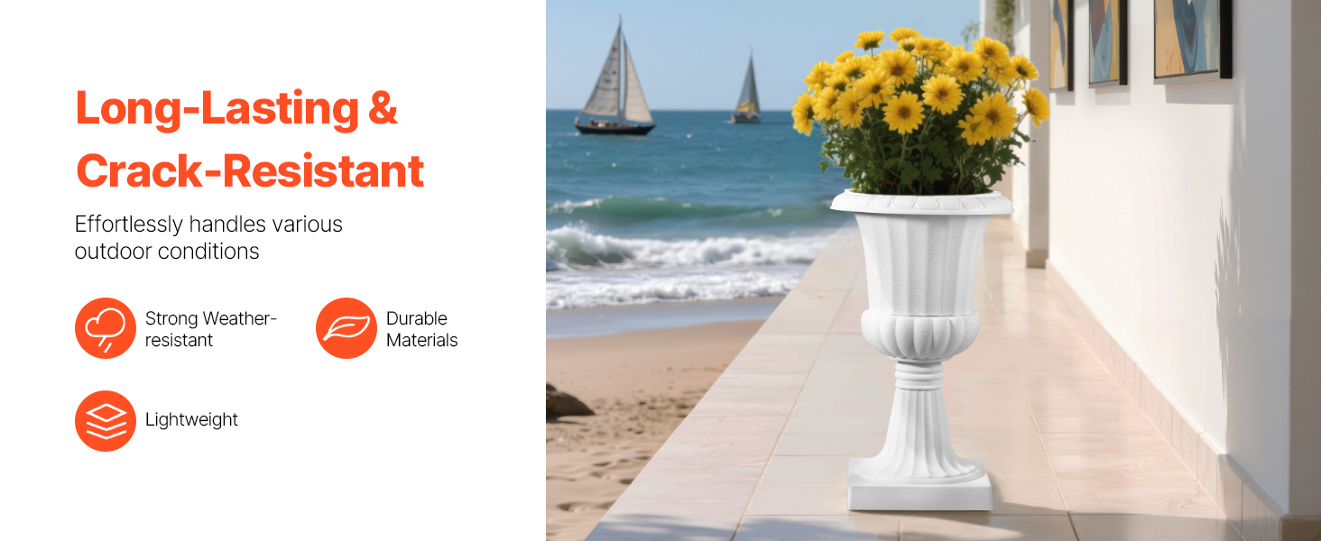 Tento podstavcový kvetináč je vyrobený z vysokokvalitných materiálov, je ľahký, odolný proti prasknutiu a navrhnutý tak, aby odolal nepriaznivým poveternostným podmienkam. Či už je slnečno alebo prší, zostane v skvelej kondícii celé roky.