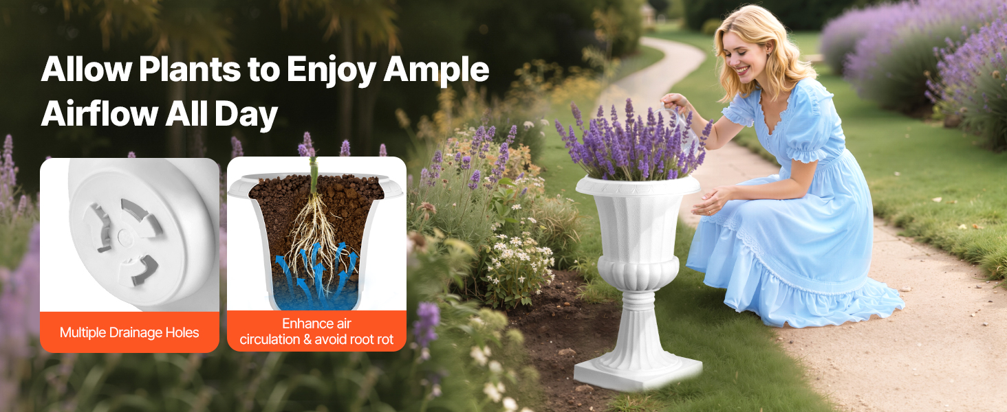 Vďaka viacerým drenážnym otvorom táto kvetinová urna podporuje cirkuláciu vzduchu a rýchly odtok vody, čím udržiava korene vašich rastlín svieže a zdravé po celý deň a pomáha im tak prosperovať.