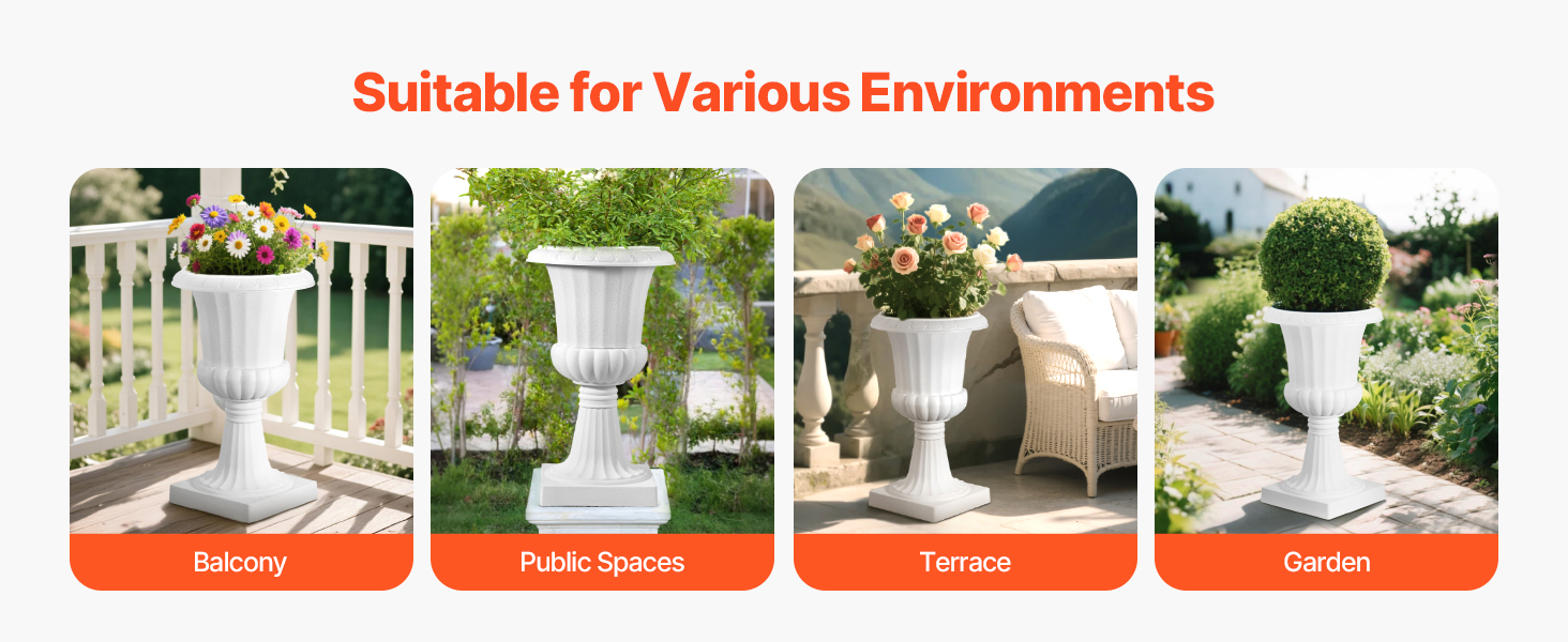 Tento klasický kvetináč je ideálny na balkóny, terasy, záhrady alebo verejné priestranstvá. Bez problémov zapadne do každého prostredia a s minimálnym úsilím vnesie do každého priestoru prirodzený pôvab.