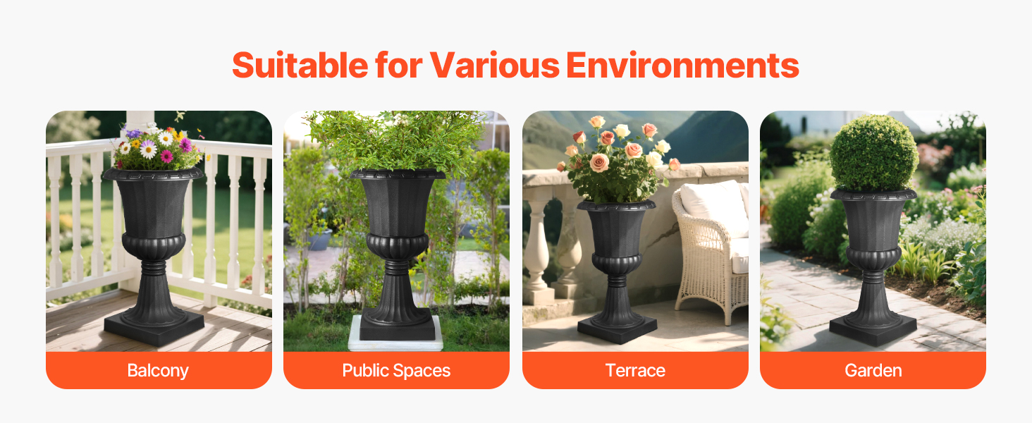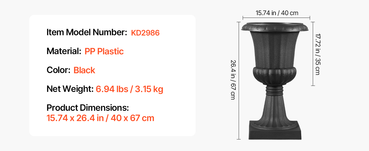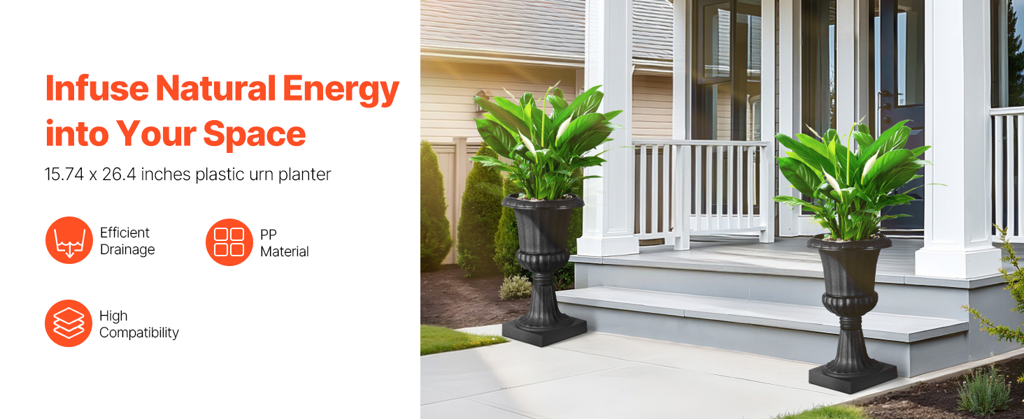 Plastová urna s rozmermi 15,8 x 26,4 palca sa dokonale hodí pre rôzne rastliny. Je vyrobený z odolného PP materiálu, je ľahký a má inteligentný drenážny systém, ideálny na použitie v interiéri alebo exteriéri, aby dodal vášmu priestoru nádych prírody.