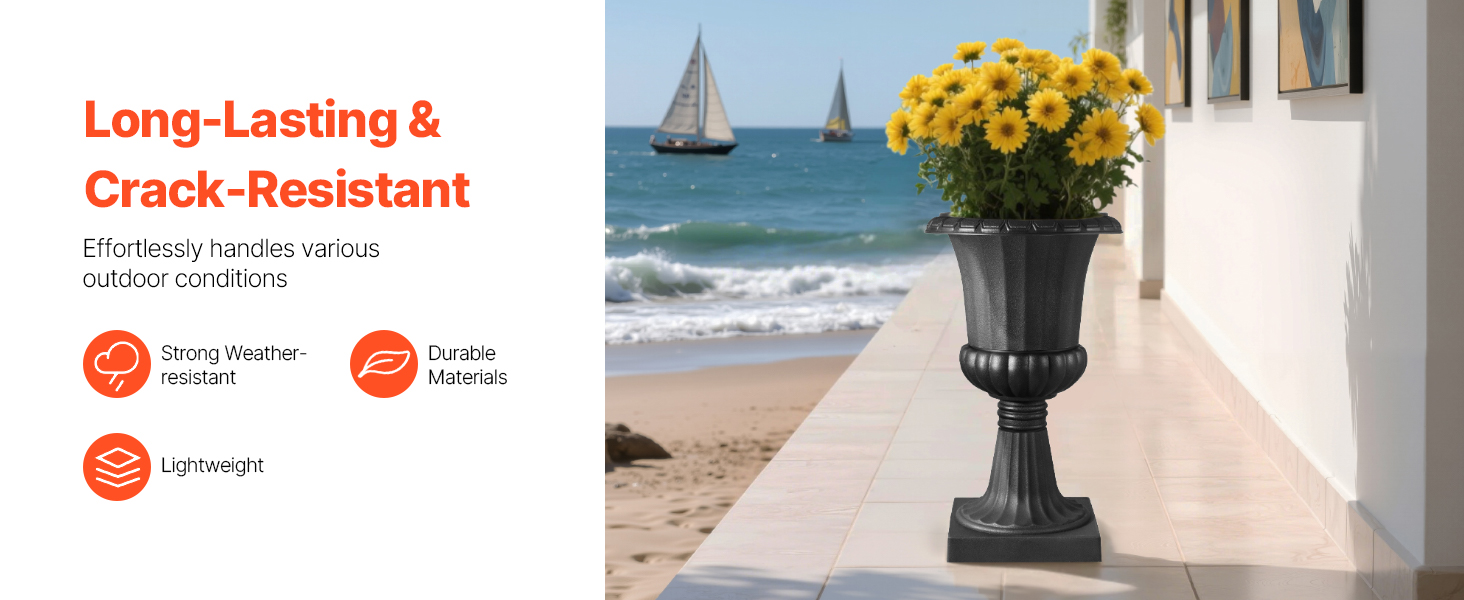 Tento podstavcový kvetináč je vyrobený z vysokokvalitných materiálov, je ľahký, odolný proti prasknutiu a navrhnutý tak, aby odolal nepriaznivým poveternostným podmienkam. Či už je slnečno alebo prší, zostane v skvelej kondícii celé roky.