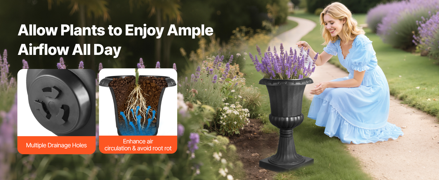 Vďaka viacerým drenážnym otvorom táto kvetinová urna podporuje cirkuláciu vzduchu a rýchly odtok vody, čím udržiava korene vašich rastlín svieže a zdravé po celý deň, a pomáha im tak prosperovať.