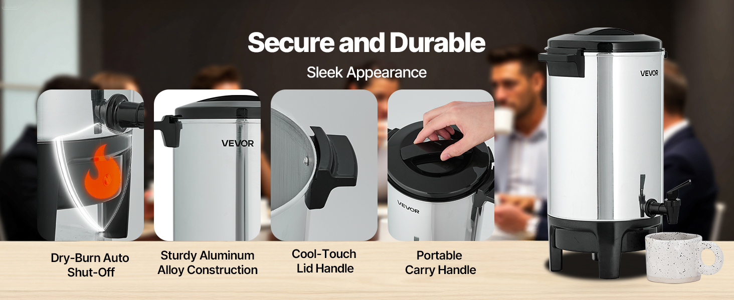 Táto urna ponúka rýchly ohrev, dlhotrvajúcu izoláciu a dvojitý kohútik bez kvapkania. Opakovane použiteľný sieťový filter sa ľahko čistí a šetrí náklady. Je navrhnutá s ochranou proti varu za sucha, chladnými rukoväťami na dotyk a odolným telom, takže je ideálna pre reštaurácie, kancelárie a bankety.