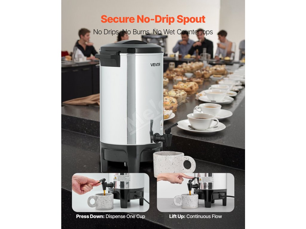 Naša veľká urna na kávu udrží kávu horúcu celé hodiny, pričom si zachováva bohatú chuť. Dvojitý výpust bez odkvapkávania umožňuje podávanie jednej šálky aj priebežné nalievanie bez rozliatia alebo popálenia, vďaka čomu je výdaj kávy bezpečnejší a pohodlnejší.