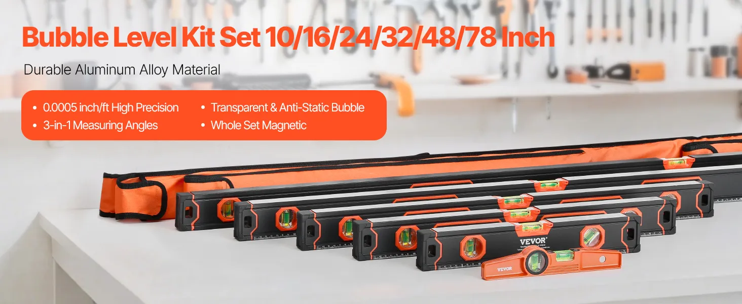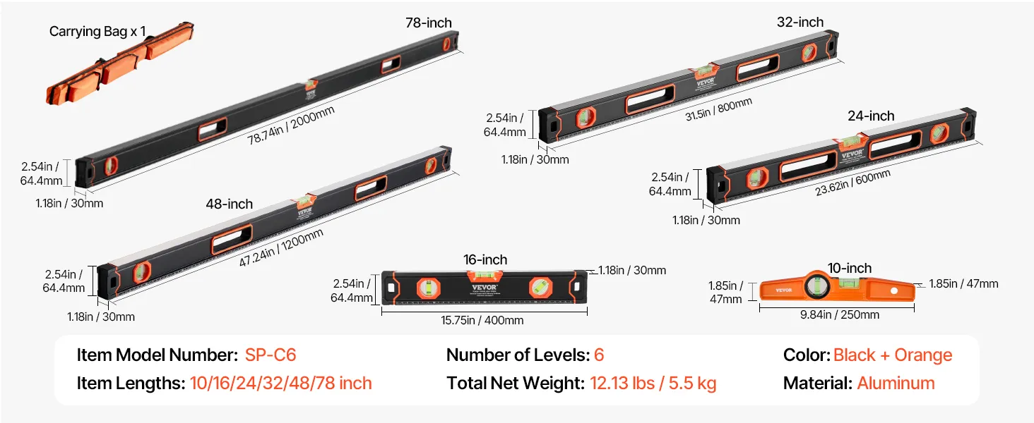 Torpédové magnetické vodováhy 6 ks 78/48/32/24/16/10 inch, 45/90/180°