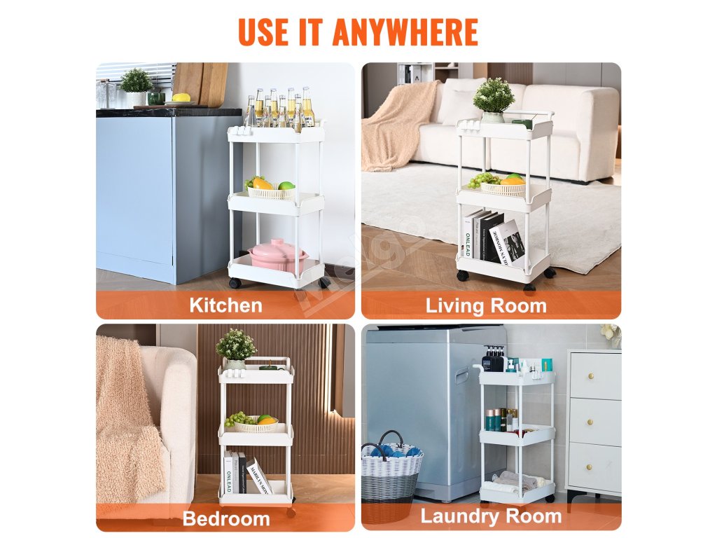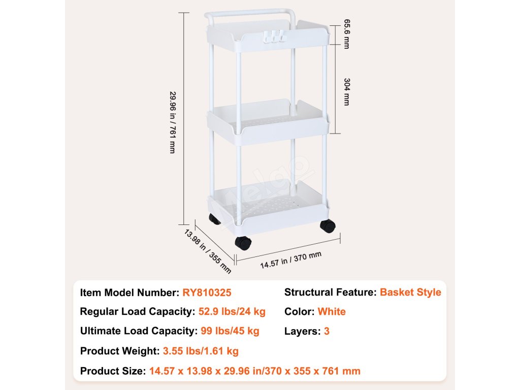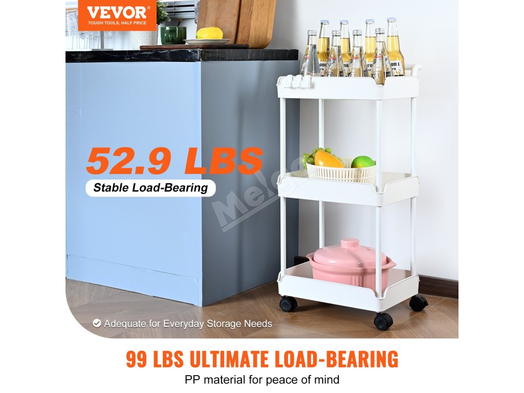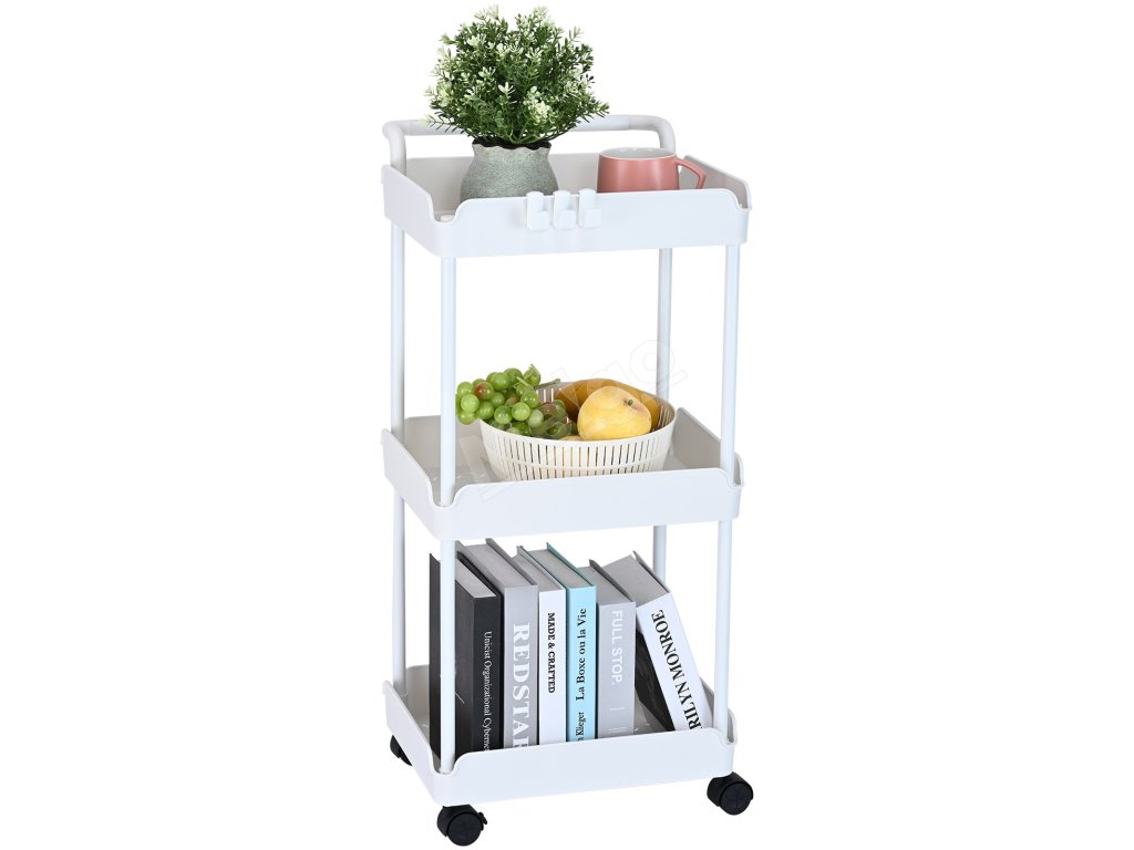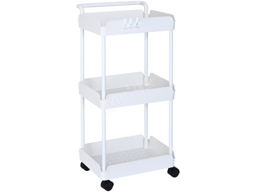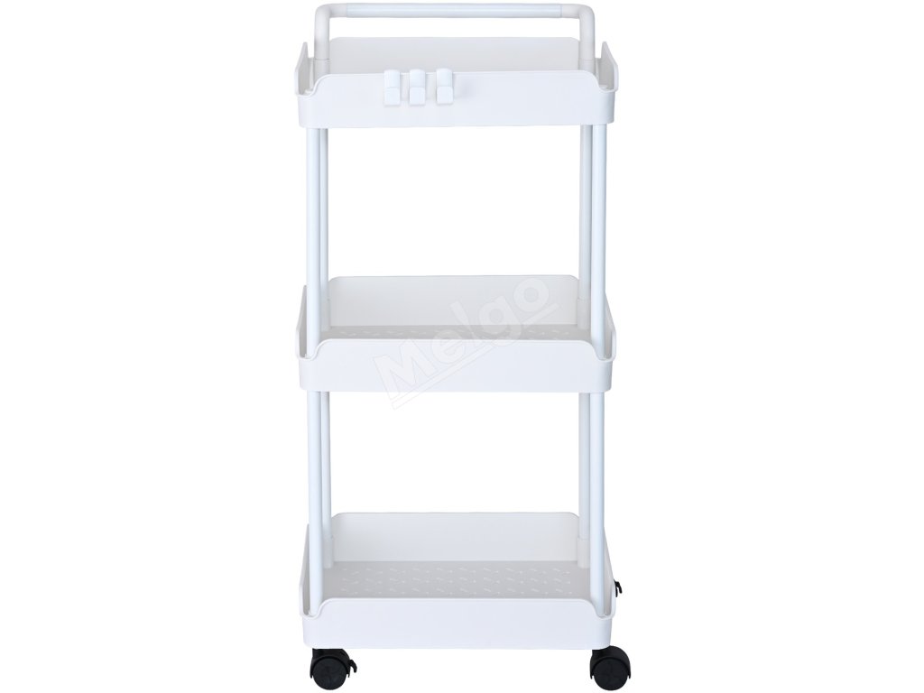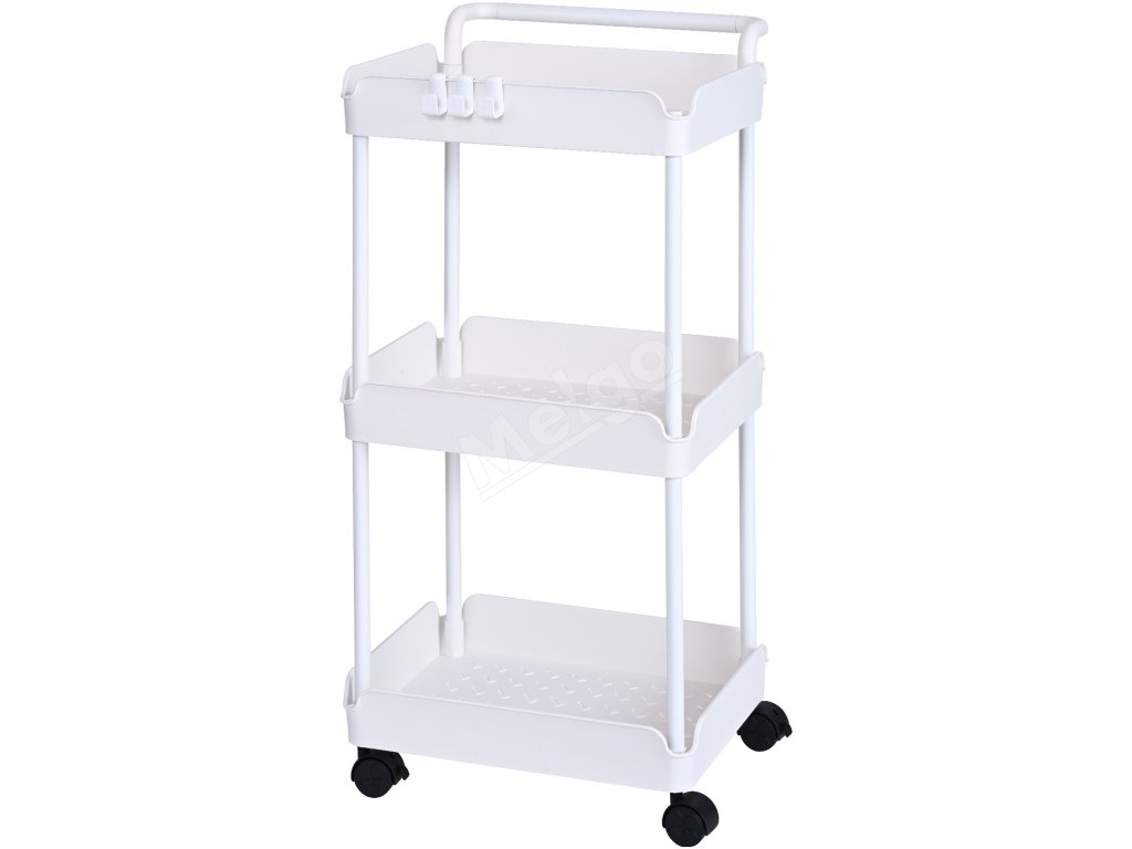 Pojazdný 3-poschodový vozík s úchytom a uzamykacími kolieskami, biely