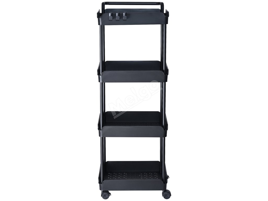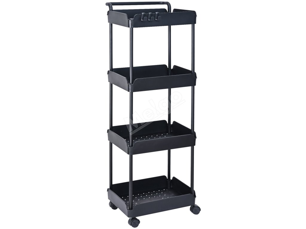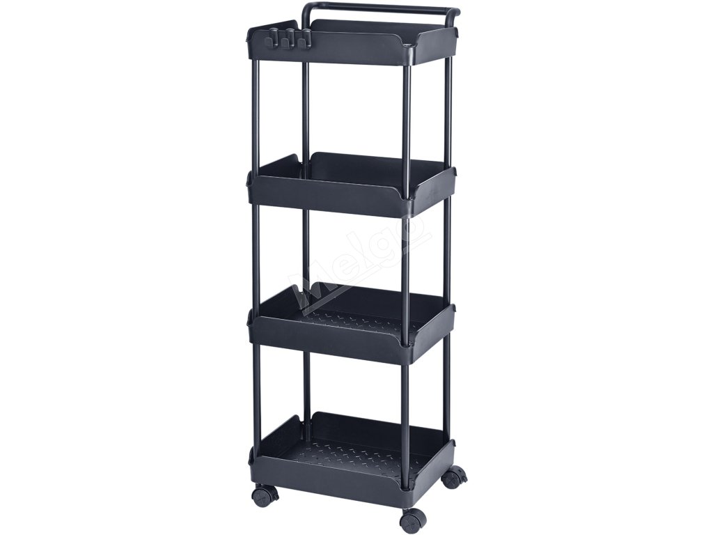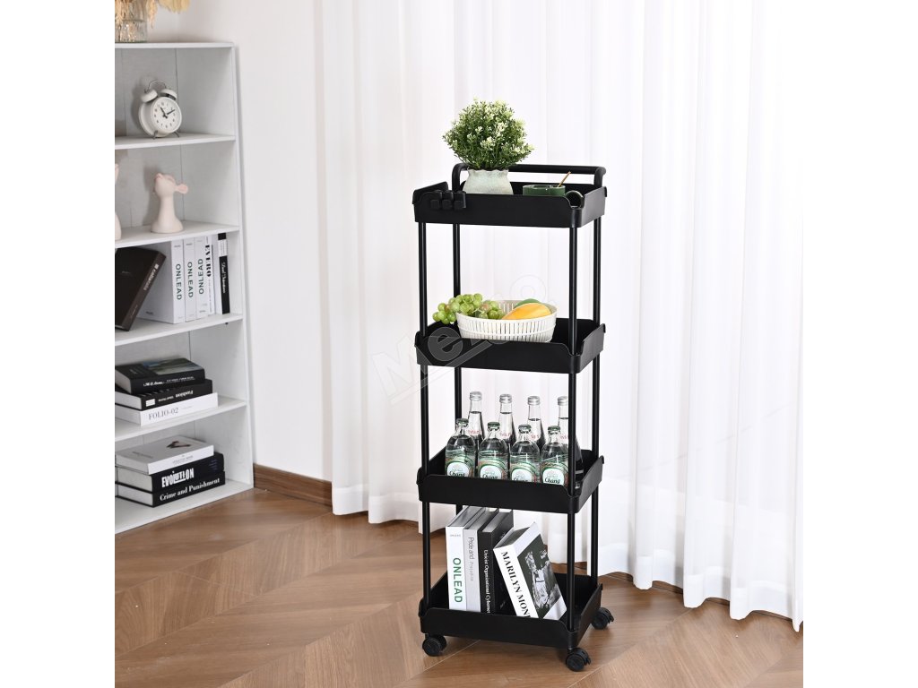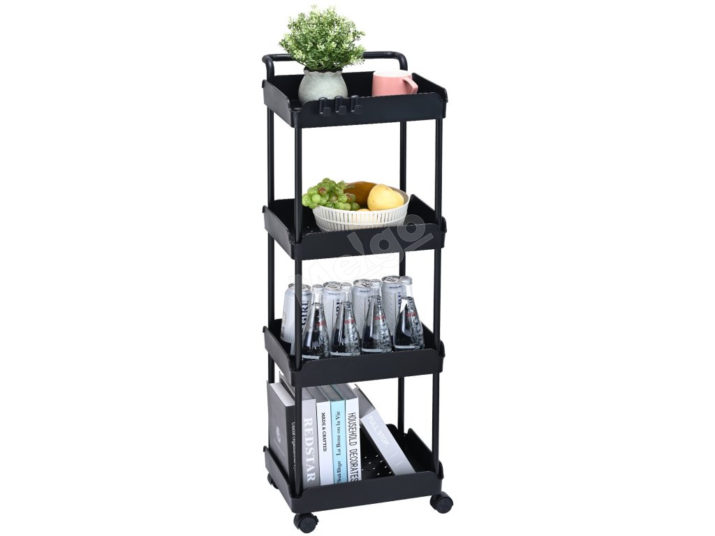 Pojazdný 4-poschodový vozík s rukoväťou, brzdené kolieska, čierny