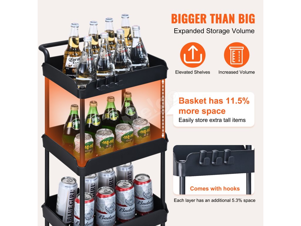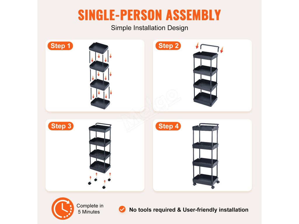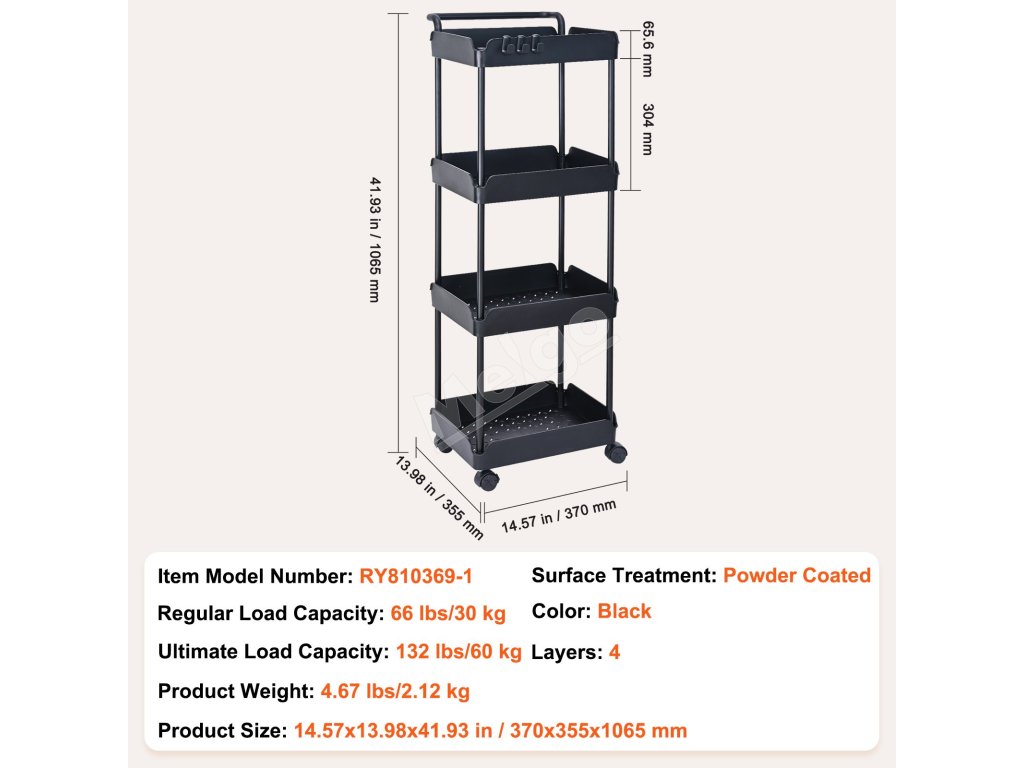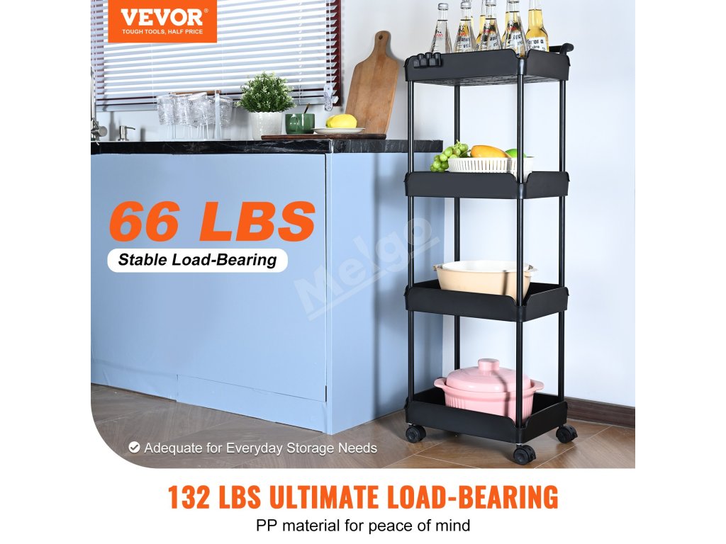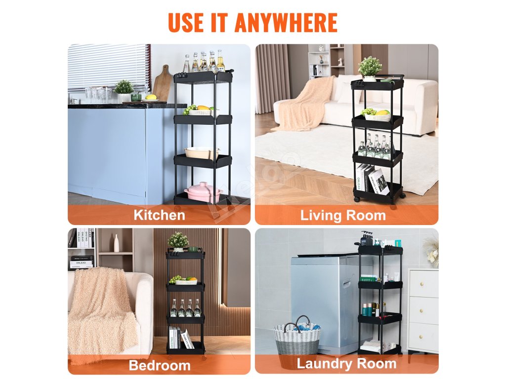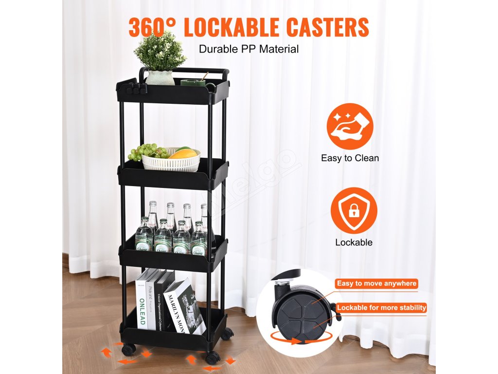 Pojazdný 4-poschodový vozík s rukoväťou, brzdené kolieska, čierny
