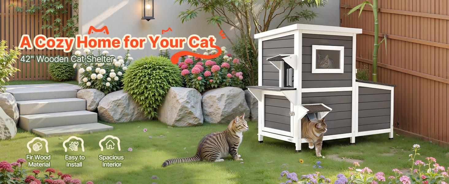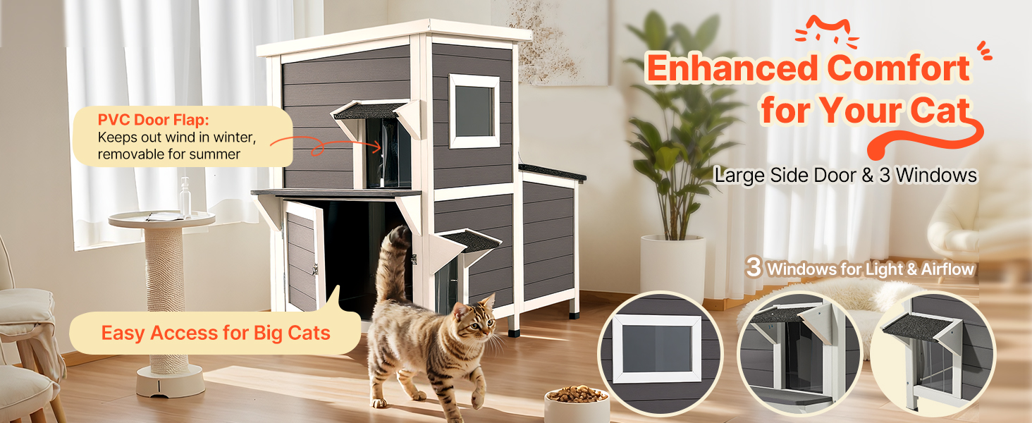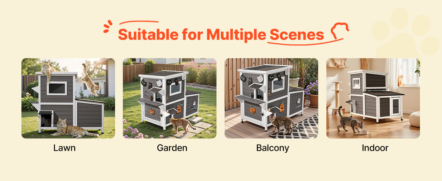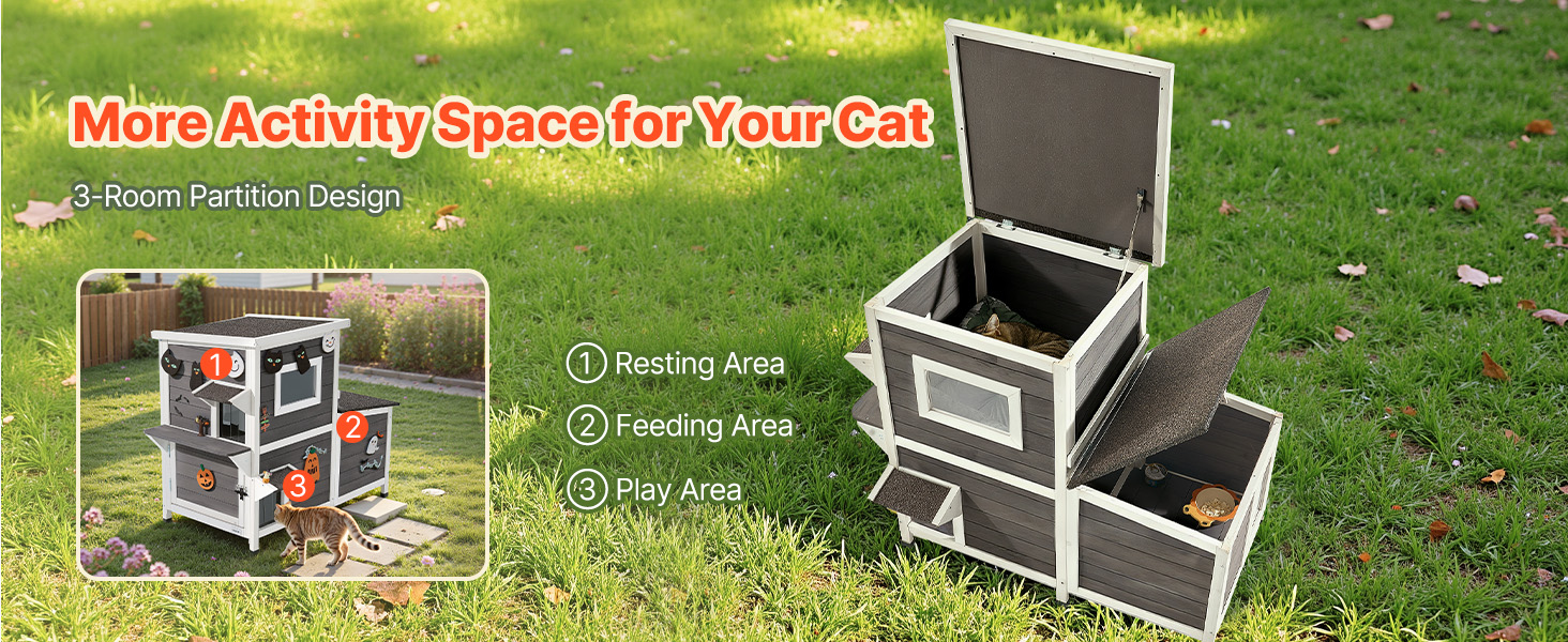 Tento vyvýšený domček pre mačky má vyhradené priestory na kŕmenie, odpočinok a hru. Každá oblasť ponúka súkromný priestor pre mačku, vďaka čomu je ideálny pre domácnosti s viacerými mačkami na zníženie stresu a poskytnutie súkromného priestoru.