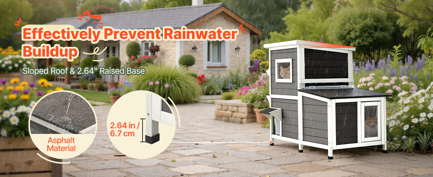 Prístrešok pre divoké mačky s asfaltovou šikmou strechou a 2,64" (6,7 cm) vyvýšenou základňou, ktorá zabraňuje prenikaniu dažďa, vlhkosti a chladu. Zabezpečuje, aby mačky zostali v teple a suchu po celý rok.