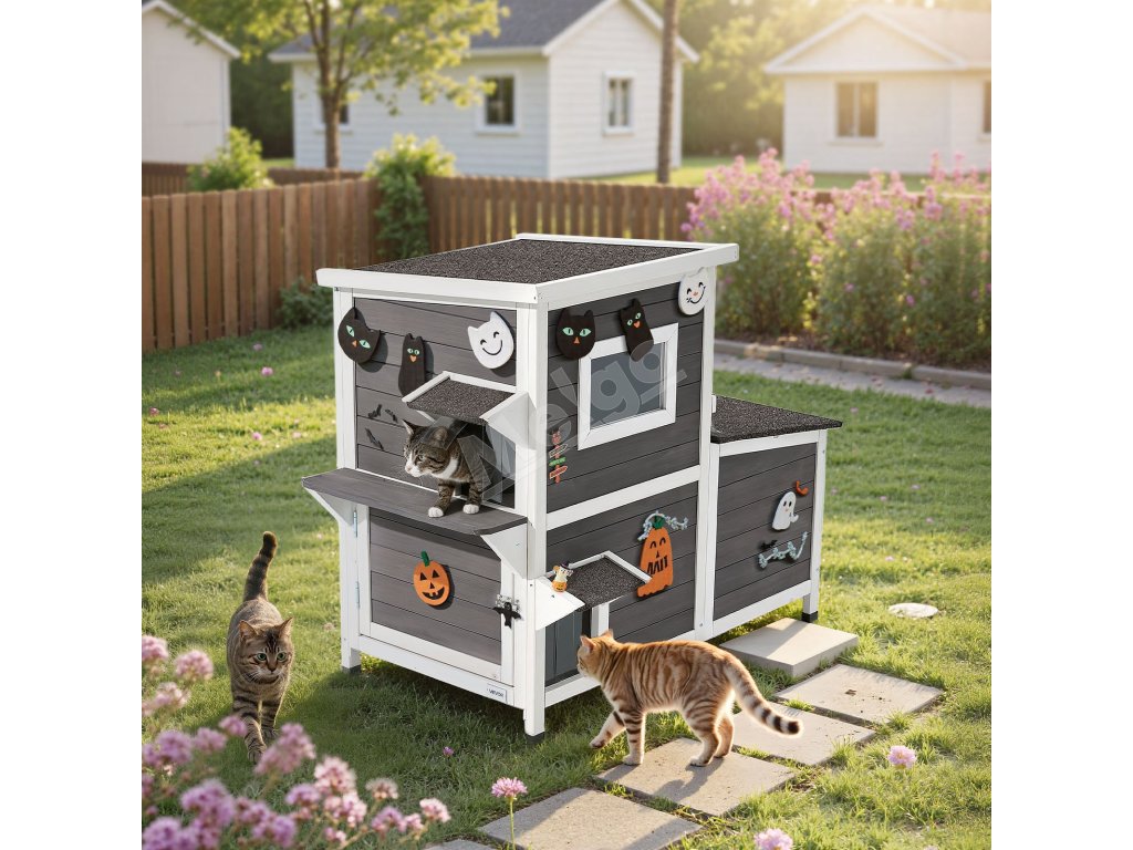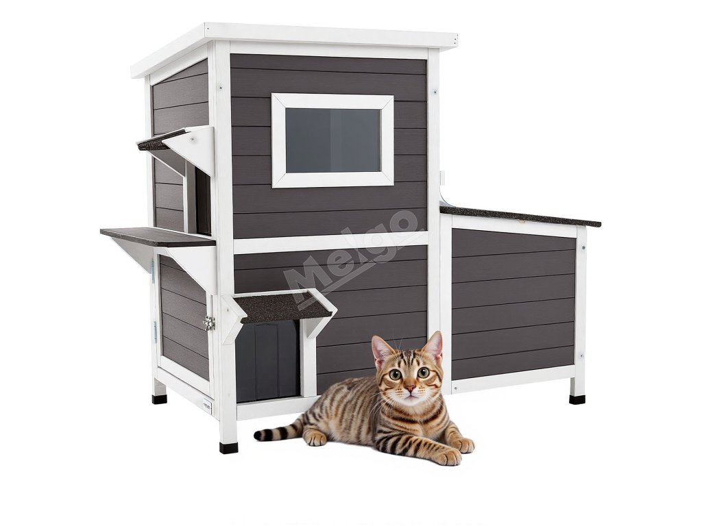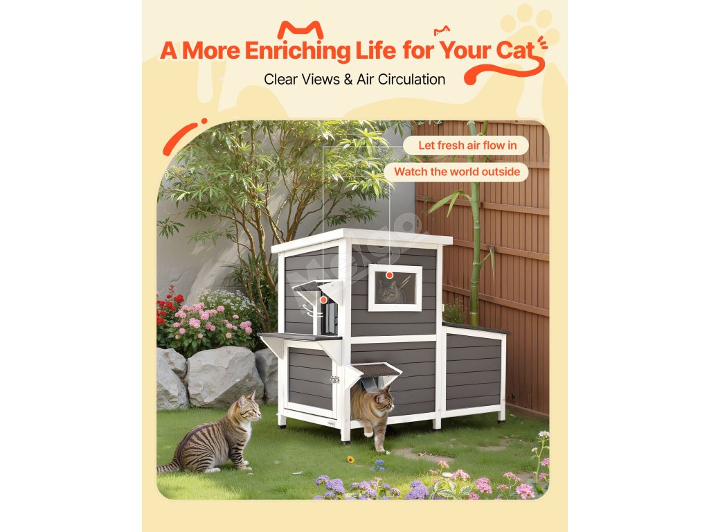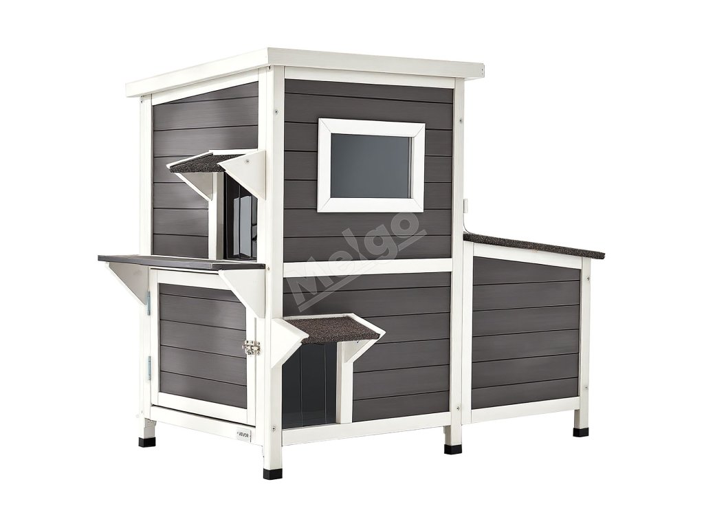 Tento vyvýšený domček pre mačky má vyhradené priestory na kŕmenie, odpočinok a hru. Každá oblasť ponúka súkromný priestor pre mačku, vďaka čomu je ideálny pre domácnosti s viacerými mačkami na zníženie stresu a poskytnutie súkromného priestoru.