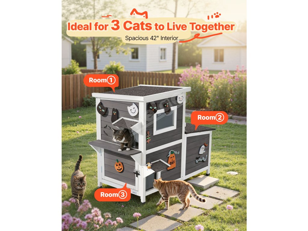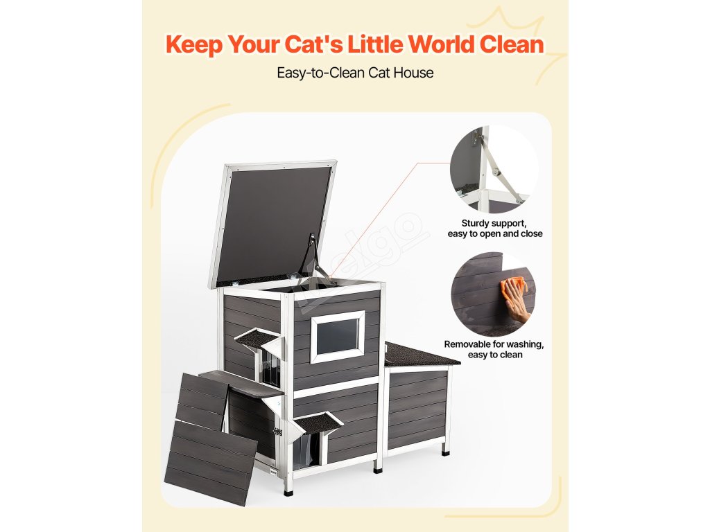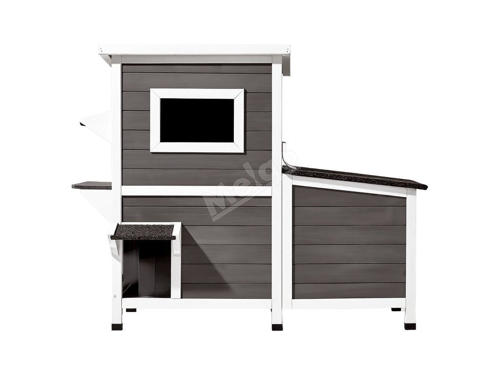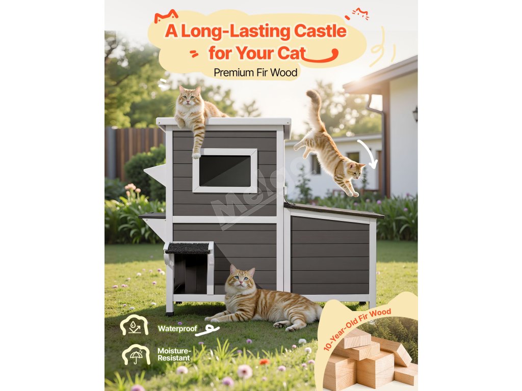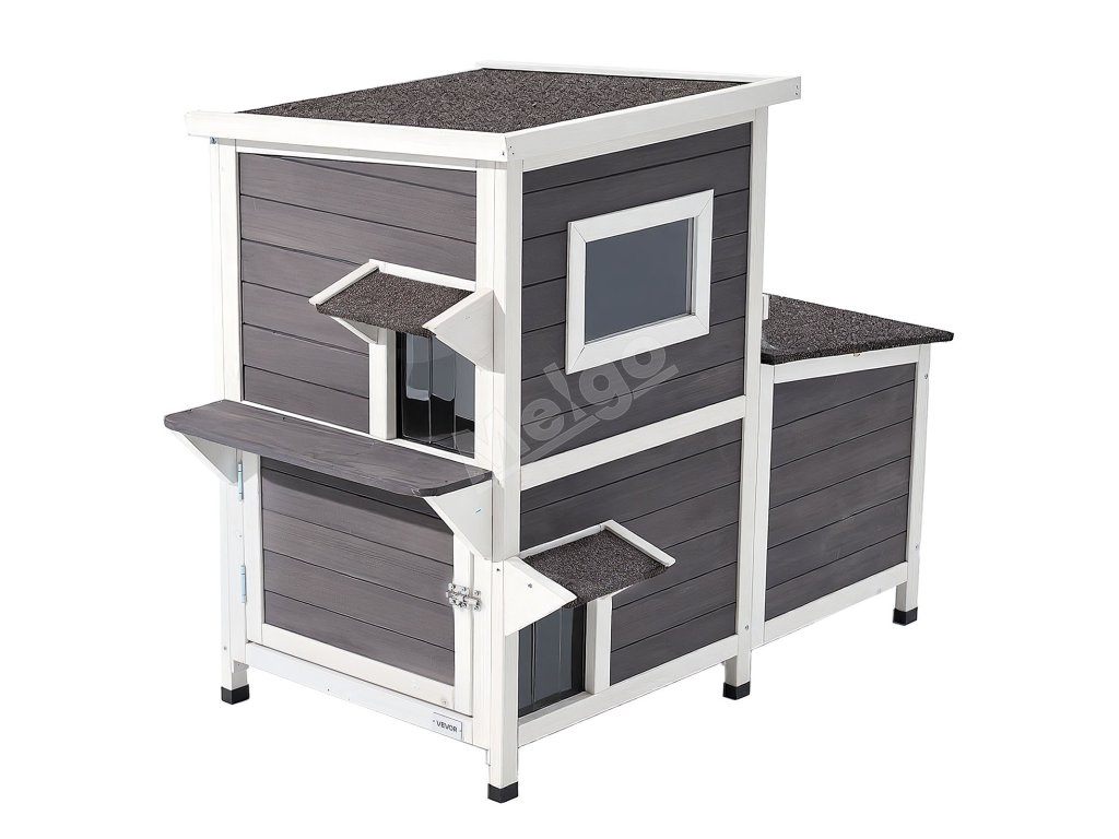 Tento vyvýšený domček pre mačky má vyhradené priestory na kŕmenie, odpočinok a hru. Každá oblasť ponúka súkromný priestor pre mačku, vďaka čomu je ideálny pre domácnosti s viacerými mačkami na zníženie stresu a poskytnutie súkromného priestoru.