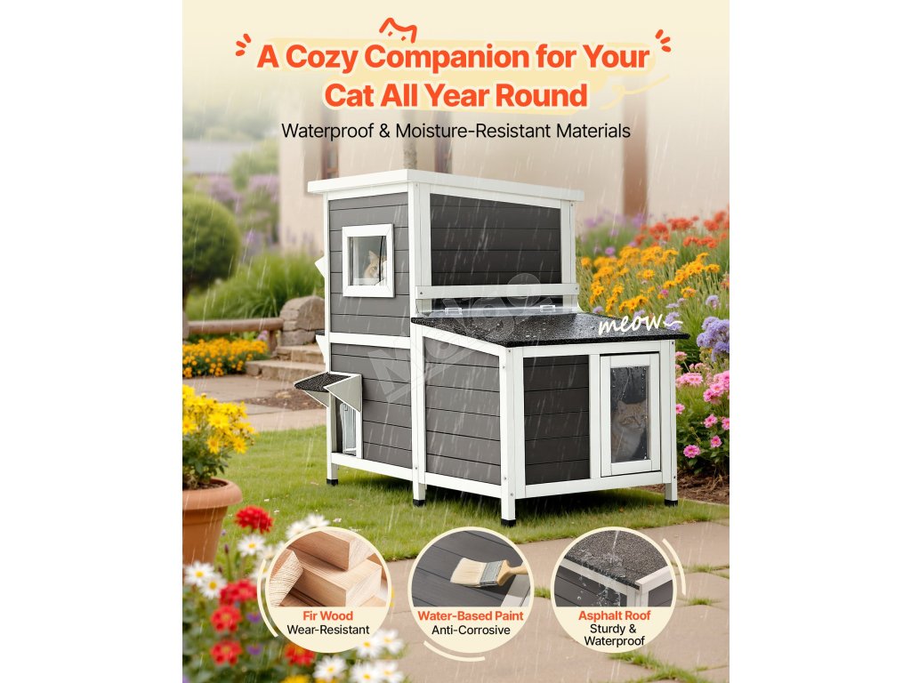 Prístrešok pre divoké mačky s asfaltovou šikmou strechou a 2,64" (6,7 cm) vyvýšenou základňou, ktorá zabraňuje prenikaniu dažďa, vlhkosti a chladu. Zabezpečuje, aby mačky zostali v teple a suchu po celý rok.