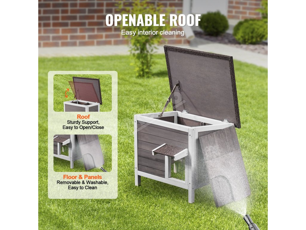 Tento vonkajší domček pre mačky je vyrobený z vysokokvalitného jedľového dreva a natretý vodou riediteľnou farbou a ponúka viacvrstvovú ochranu, ktorá je odolná voči korózii. Štyri vodotesné podložky pod nohy zlepšujú vodotesné vlastnosti. Zaistite vašej mačke bezpečnosť a zdravie!