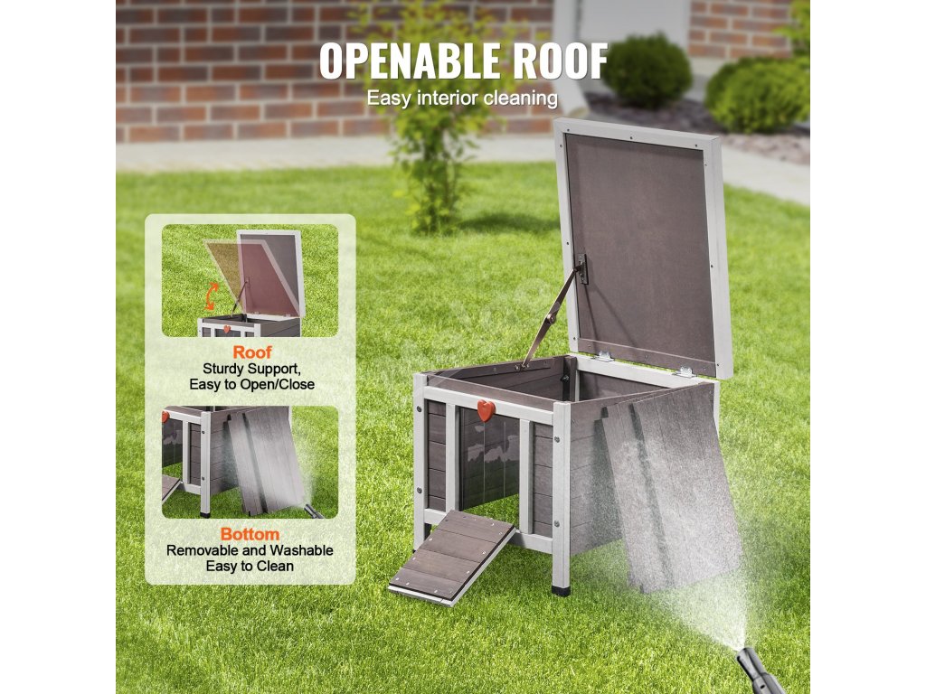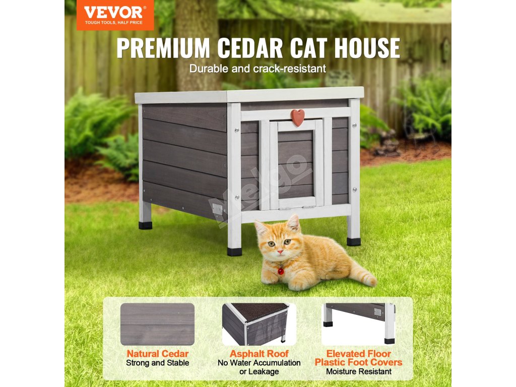 Šikmá strecha zabraňuje hromadeniu vody a poskytuje vašej mačke pohodlný priestor na odpočinok. Silné PVC závesy dverí zabezpečujú ochranu pred vetrom a dažďom a zároveň umožňujú ľahký prístup.