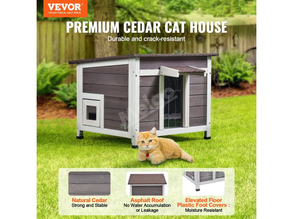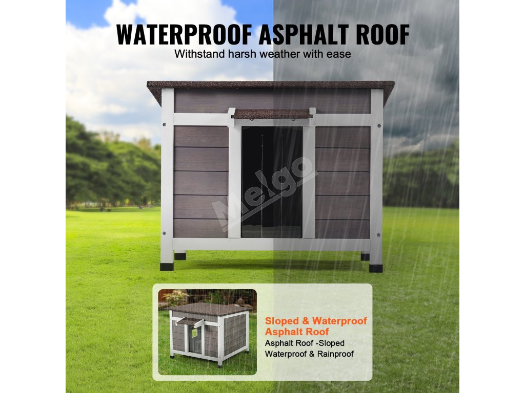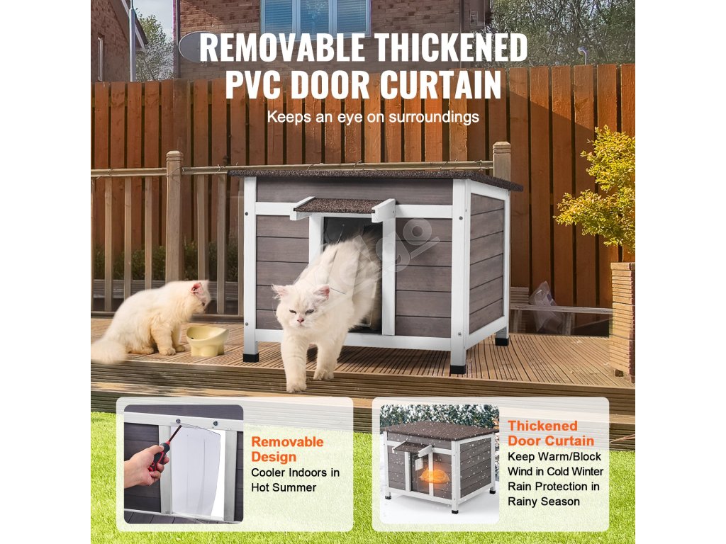 Šikmá strecha zabraňuje hromadeniu vody a poskytuje vašej mačke pohodlný priestor na odpočinok. Okap odolný proti dažďu a hrubé PVC závesy dverí zabezpečujú ochranu pred vetrom a dažďom a zároveň umožňujú ľahký prístup.