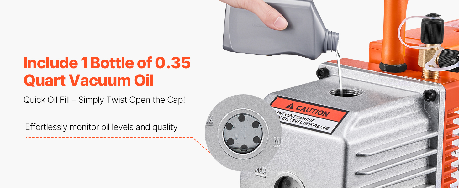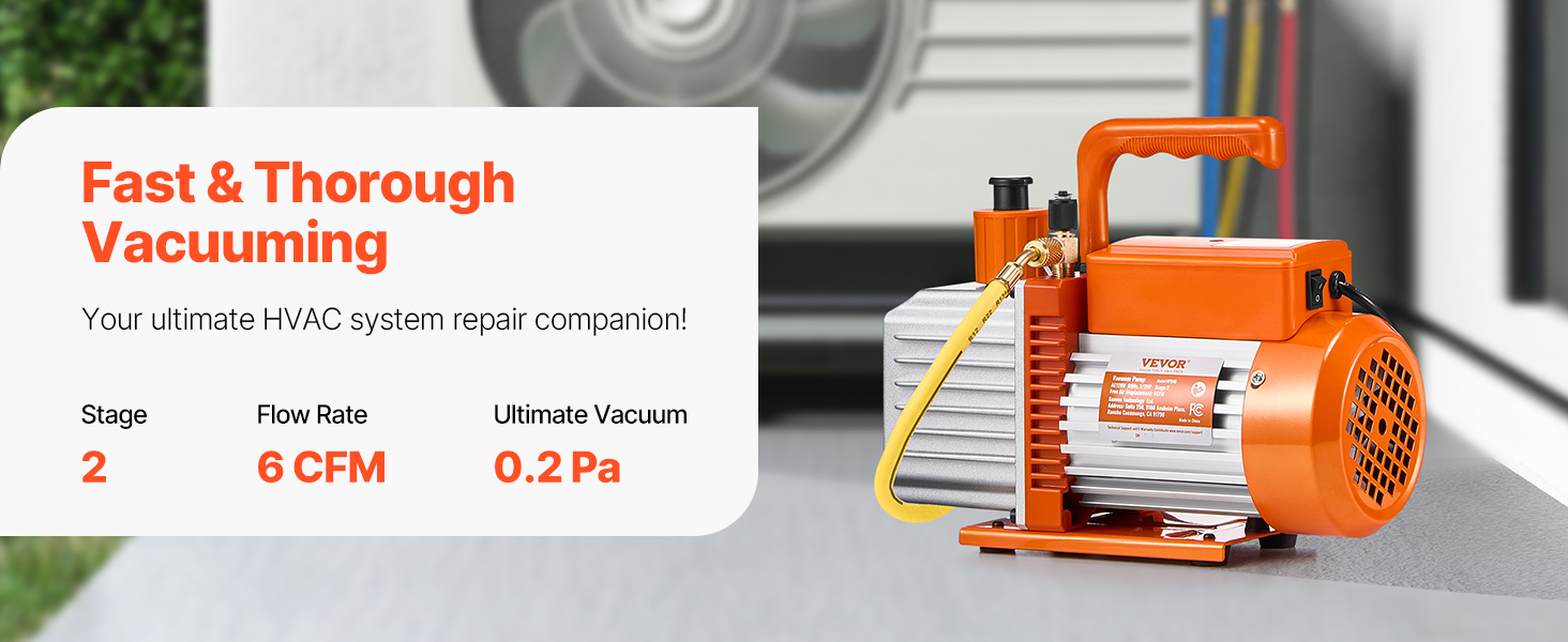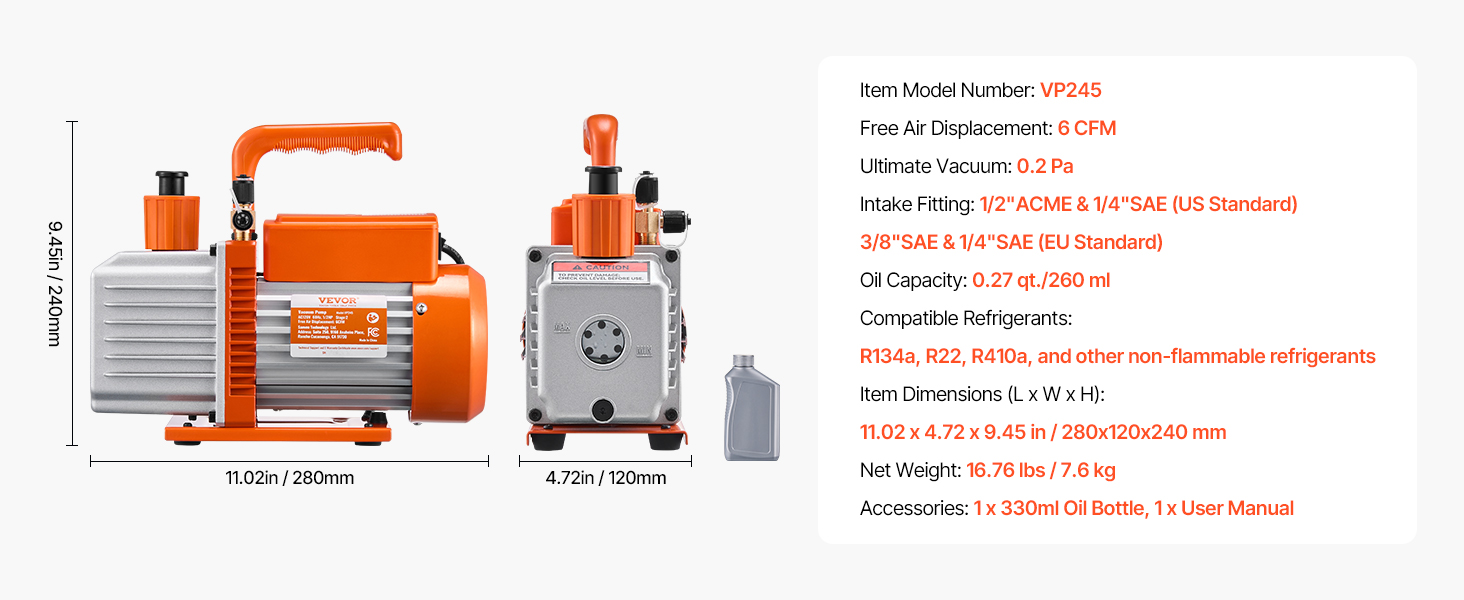 Naša 6CFM vákuová pumpa pre HVAC poskytuje rýchle odsávanie a dosahuje konečný podtlak 5 Pa. Vybavená motorom z čistej medi, 1/4" SAE a 3/8" SAE portami a fľašou s 0,35 qt vákuového oleja, ľahko opravuje automobilové alebo menšie HVAC systémy, ako sú R22, R134a a R410a.