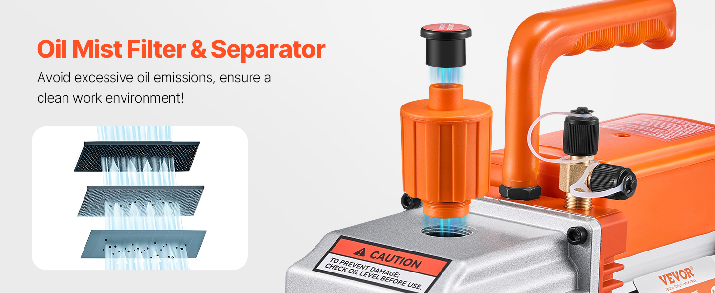 Rozlúčte sa so znečistením olejovou hmlou. Zabudovaný filtračný systém našej klimatizačnej vývevy znižuje uvoľňovanie olejovej hmly do ovzdušia, čím pomáha udržiavať čisté a bezpečné pracovné prostredie.