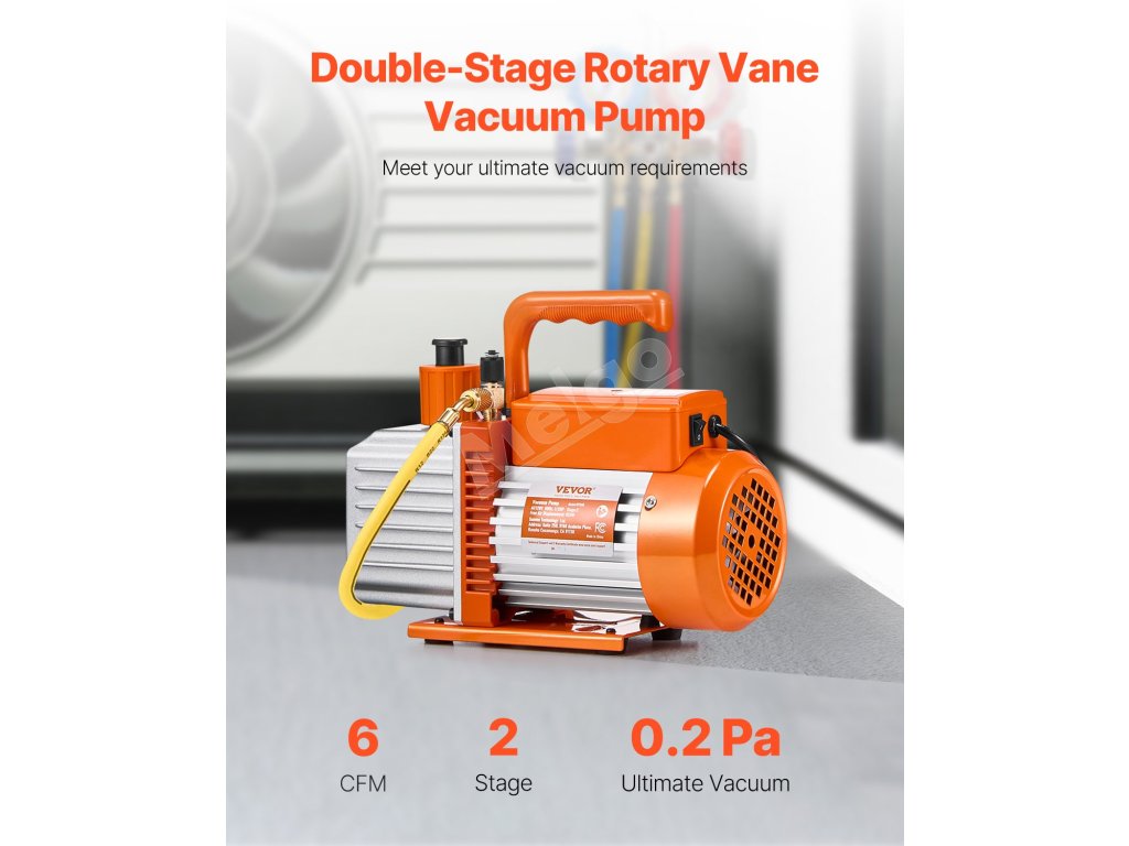 Naša 6CFM vákuová pumpa pre HVAC poskytuje rýchle odsávanie a dosahuje konečný podtlak 5 Pa. Vybavená motorom z čistej medi, 1/4" SAE a 3/8" SAE portami a fľašou s 0,35 qt vákuového oleja, ľahko opravuje automobilové alebo menšie HVAC systémy, ako sú R22, R134a a R410a.