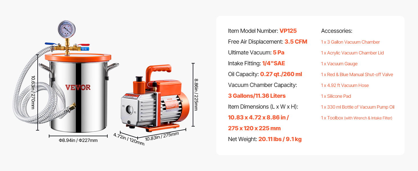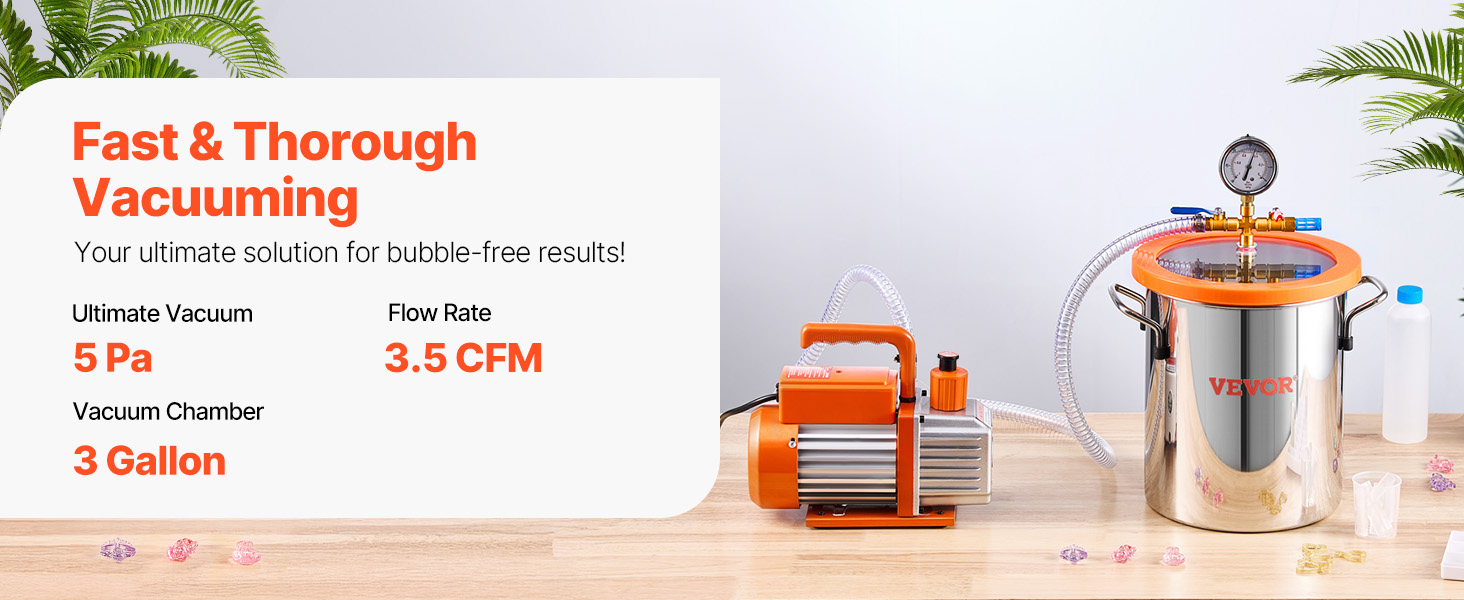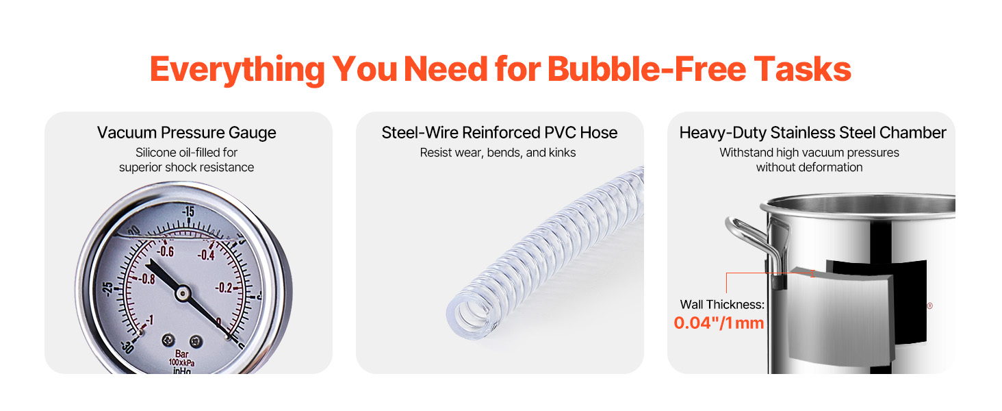 Naša súprava čerpadla s vákuovou komorou zakaždým zabezpečí rýchle a dôkladné odplynenie vďaka 4-stupňovému motoru z čistej medi a maximálnemu vákuu 5 Pa. Vákuová komora s objemom 3 galóny z nehrdzavejúcej ocele sa môže pochváliť pôsobivou odolnosťou voči tlaku, zatiaľ čo akrylové veko vám umožní ľahko monitorovať proces odplyňovania.