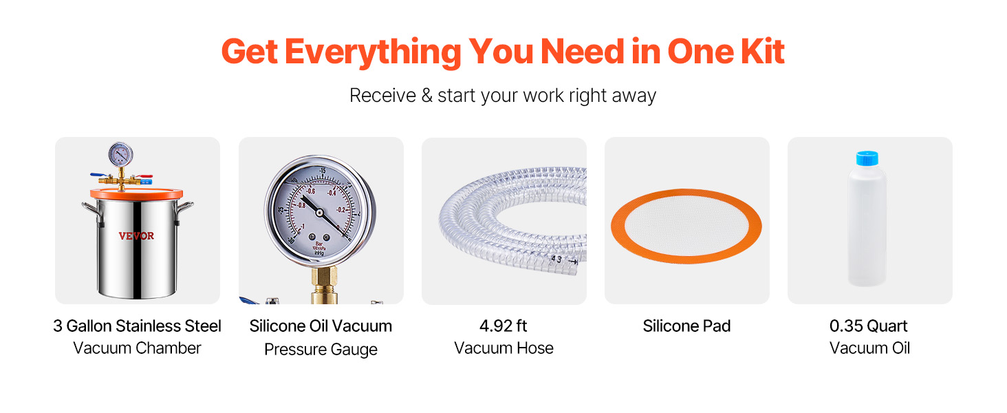 Rozlúčte sa s ťažkosťami pri hľadaní jednotlivých komponentov. Táto súprava vákuovej komory s vývevou obsahuje všetko, čo potrebujete na jednoduché zvládnutie úloh odplyňovania a odplyňovania. Všetky potrebné nástroje a príslušenstvo sú pohodlne zabalené pre bezproblémový zážitok.