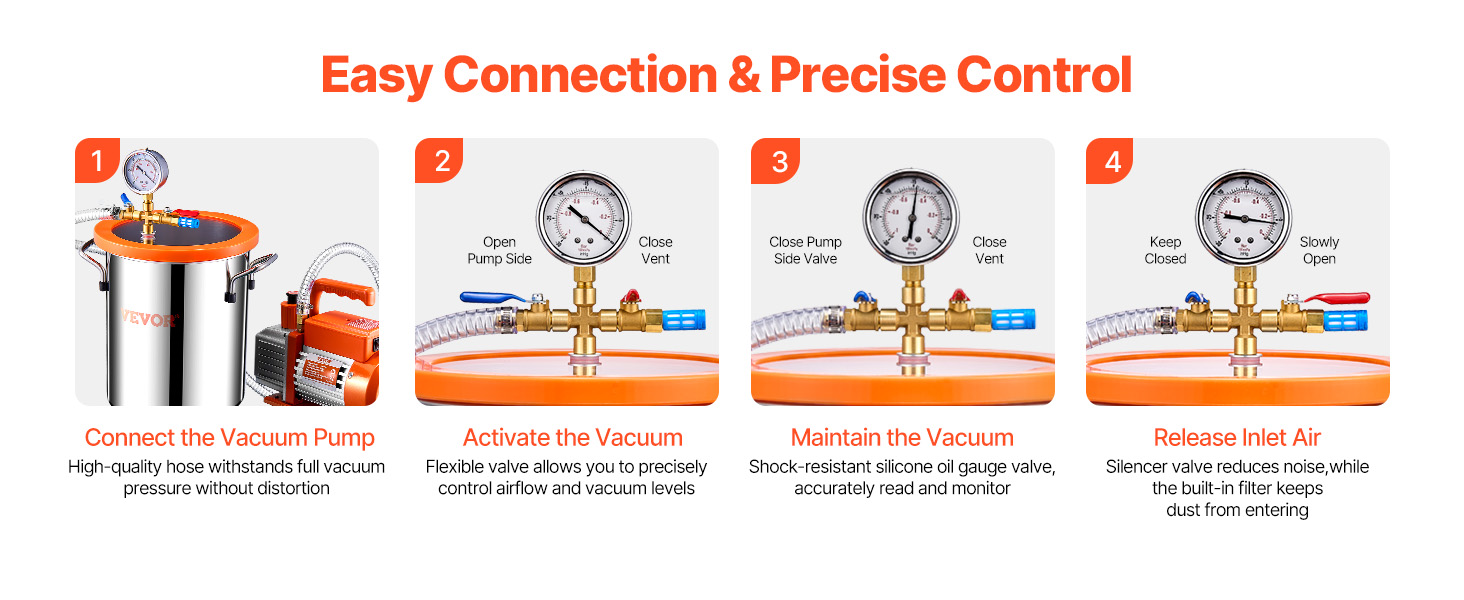 Nie je potrebné žiadne zložité nastavovanie. Úroveň vákua môžete ľahko sledovať prostredníctvom silikónového manometrického ventilu. Ventil rýchlo pripojíte pomocou závitového konektora a vákuovú pumpu pripojíte pomocou 4,92 ft hadice. Tlmiaci ventil znižuje hluk a zabudovaný filter zabraňuje prenikaniu prachu.