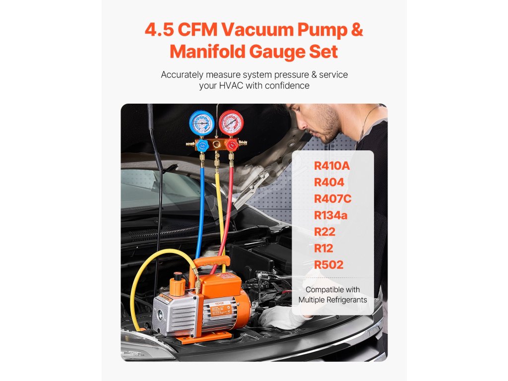 Naša sada vákuovej pumpy 4,5CFM určená pre profesionálov v oblasti HVAC a domácich majstrov obsahuje manometer PRO, 3,94 ft trojfarebnú hadicu a sadu rýchlospojok R134a. S konečným podtlakom 5 Pa je kompatibilná s chladivami R134a, R22, R12, R502, R502, R410A, R404 a R407C.