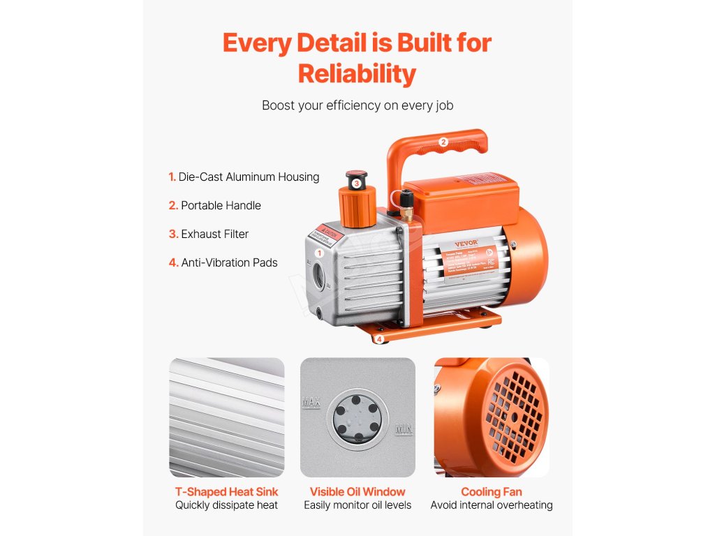 Náš pokročilý chladiaci systém udržiava vákuovú pumpu HVAC v chode pri optimálnej teplote, čím zabezpečuje konzistentné, vysoko výkonné odsávanie bez rizika prehriatia alebo straty výkonu.