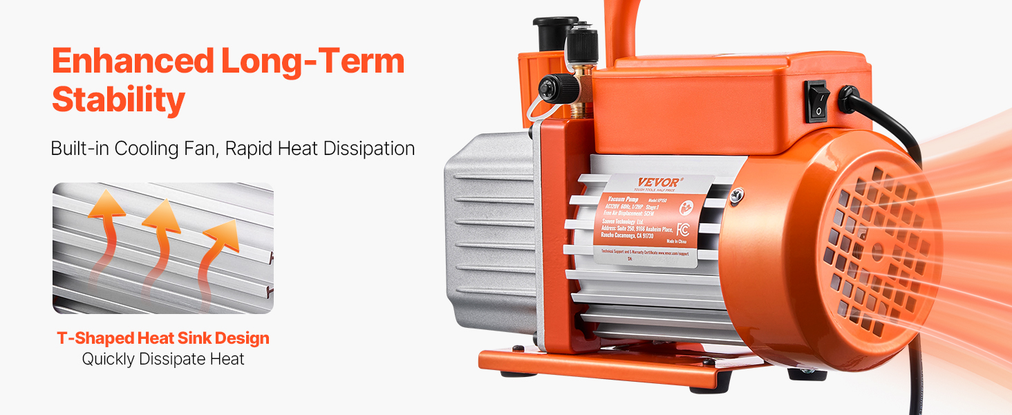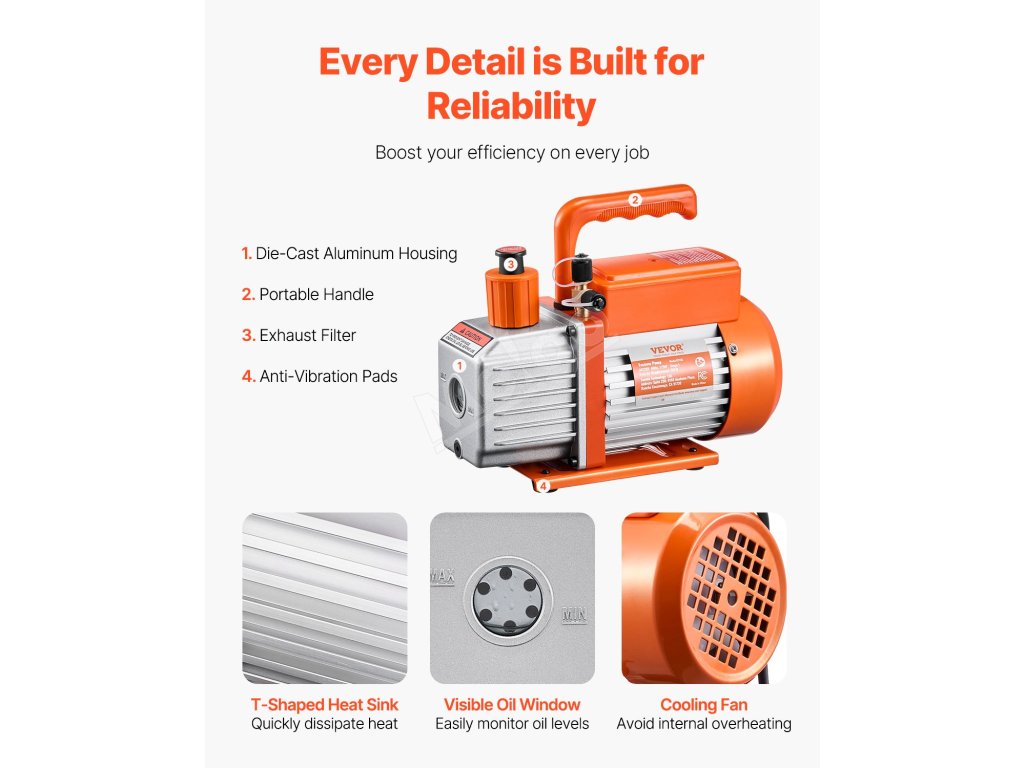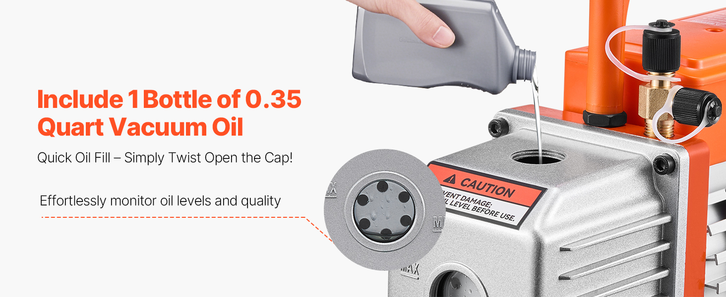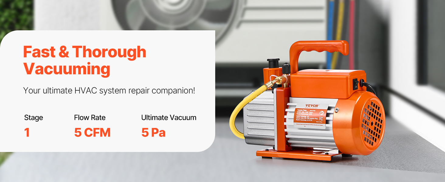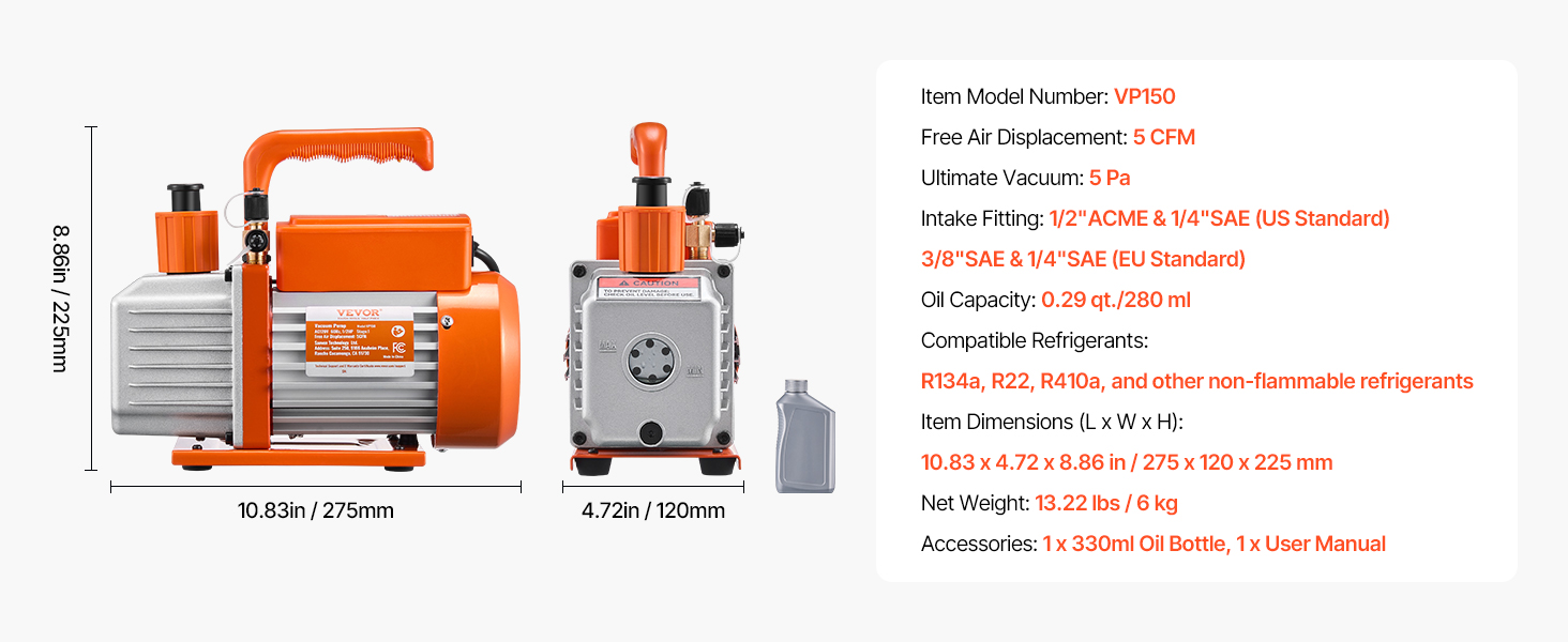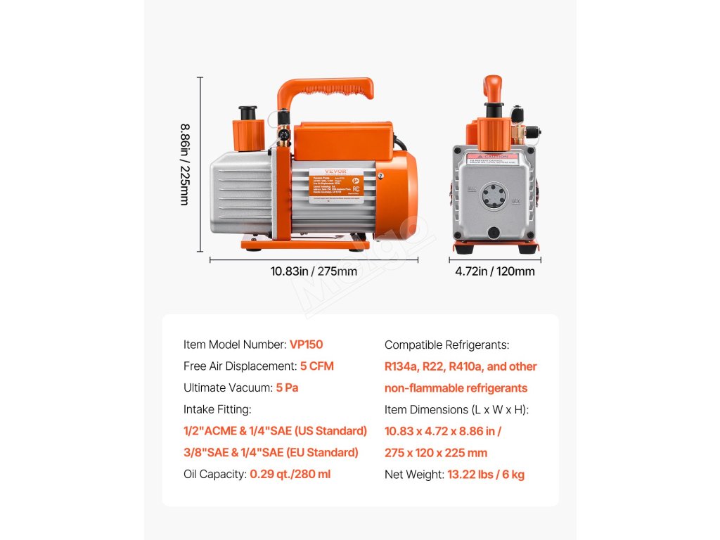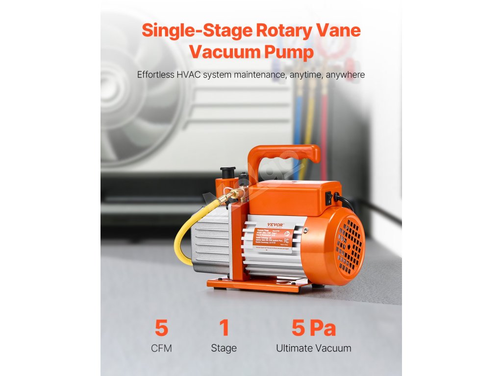 Naša 5CFM vákuová pumpa pre HVAC poskytuje rýchle odsávanie a dosahuje konečný podtlak 5 Pa. Vybavená motorom z čistej medi, 1/4" SAE a 3/8" SAE portami a fľašou s 0,35 qt vákuového oleja, ľahko opravuje automobilové alebo menšie HVAC systémy, ako sú R22, R134a a R410a.