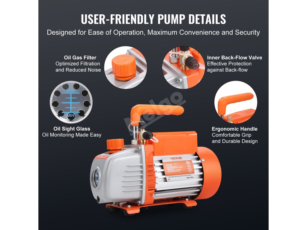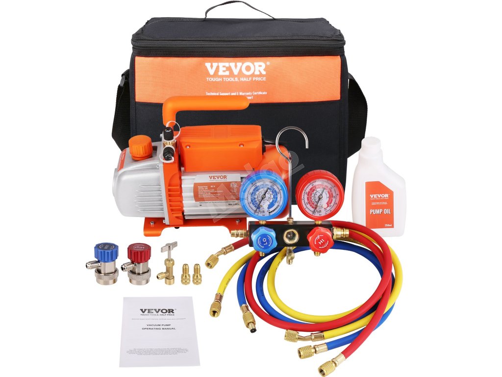 Súprava automatickej aku vývevy VEVOR je určená na meranie tlaku v chladiacich zariadeniach a odsávanie plynu na získanie vákua, ktoré spĺňa vysoké vákuové normy. Vhodná na údržbu vzduchotechniky, klimatizácie a chladiacich zariadení v automobilovom priemysle.