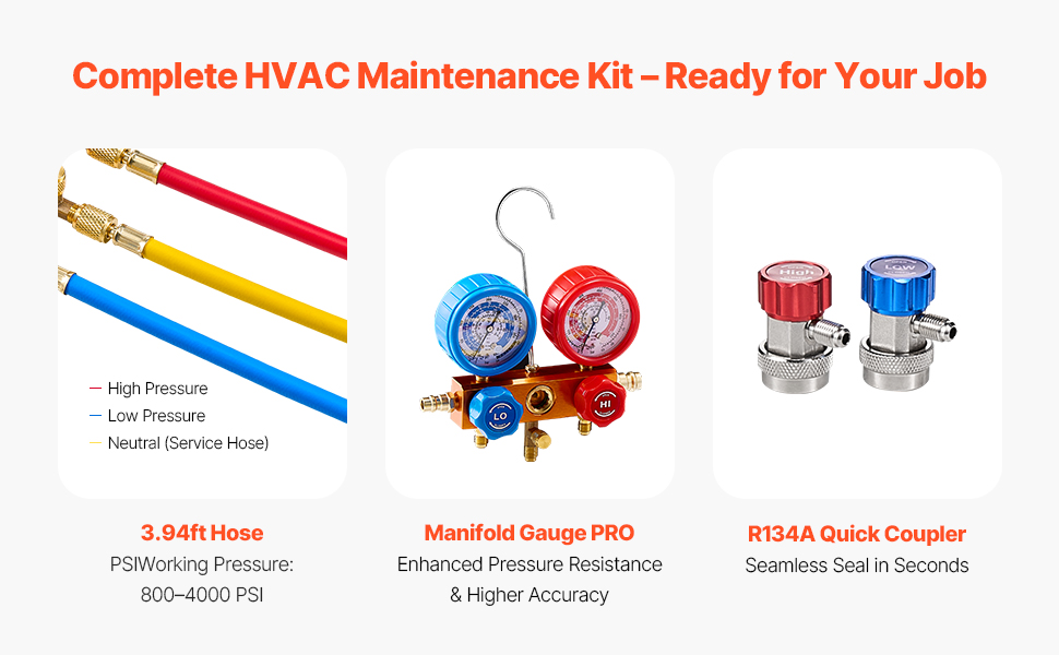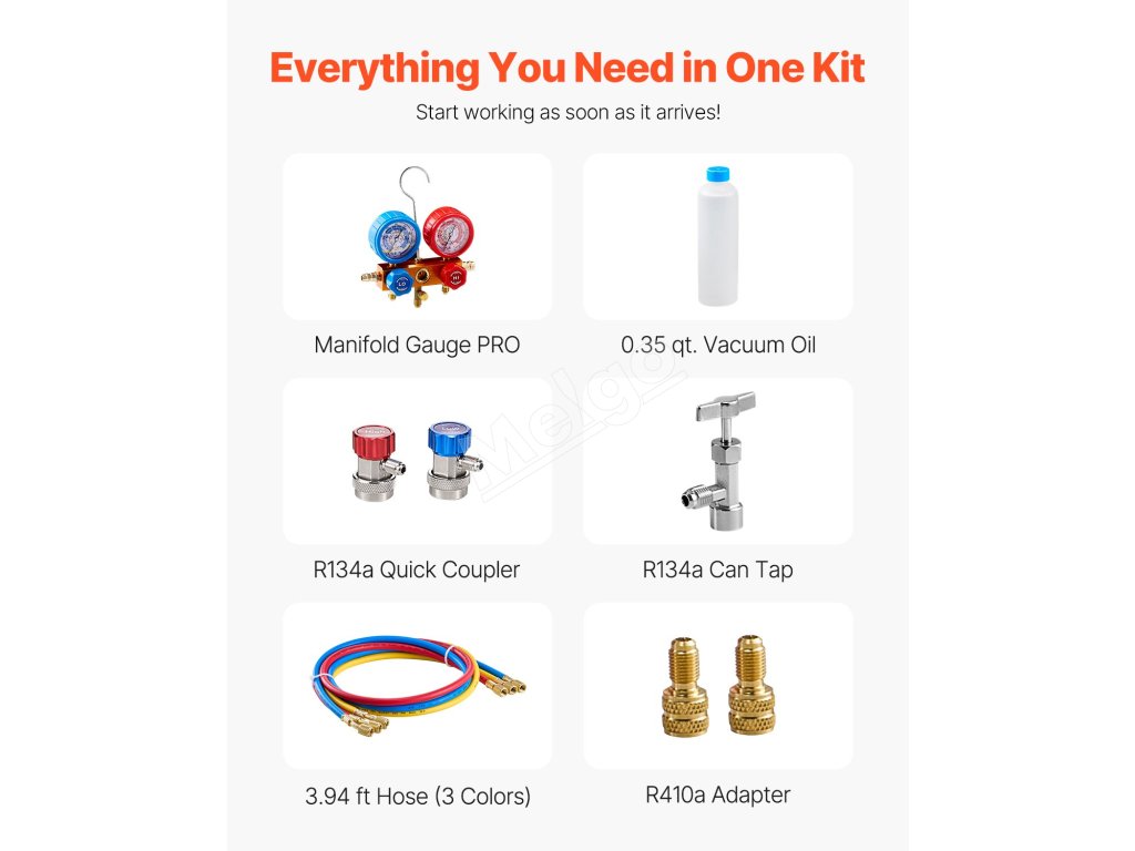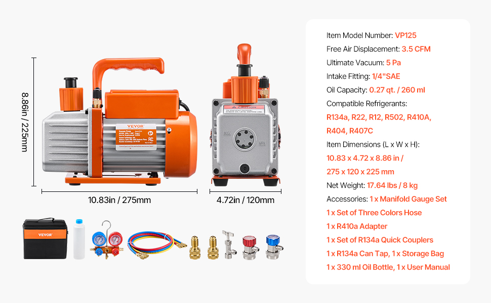 Naša sada vákuovej pumpy 3,5CFM, ktorá je špeciálne navrhnutá pre profesionálov v oblasti HVAC a domácich majstrov, obsahuje manometer PRO, 3,94 ft trojfarebnú hadicu a sadu rýchlospojok R134a. S konečným podtlakom 5 Pa, kompatibilná s chladivami R134a, R22, R12, R502, R502, R410A, R404 a R407C.