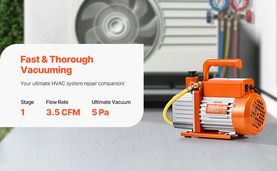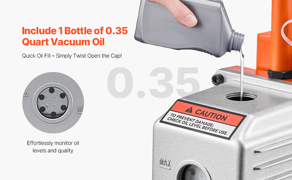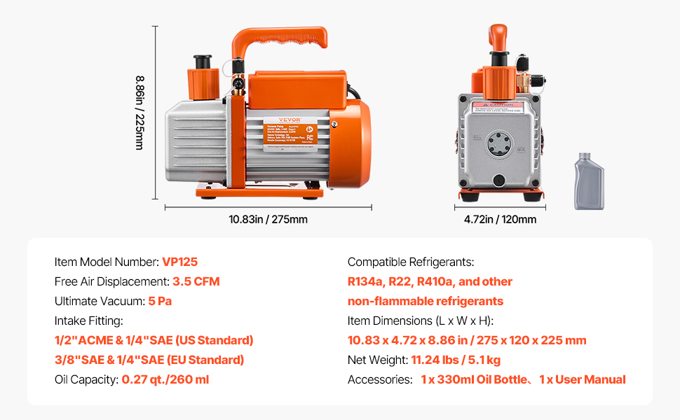 Naša 3,5CFM vákuová pumpa pre HVAC poskytuje rýchle odsávanie a dosahuje najvyššie vákuum 5 Pa. Vybavená motorom z čistej medi, 1/4" SAE a 3/8" SAE portami a fľašou s 0,35 qt vákuového oleja ľahko opraví automobilové alebo menšie HVAC systémy, ako sú R22, R134a a R410a.