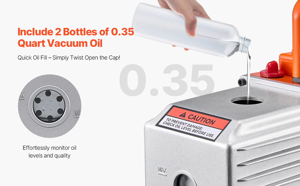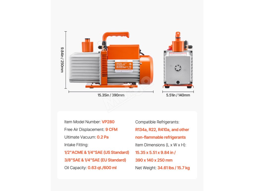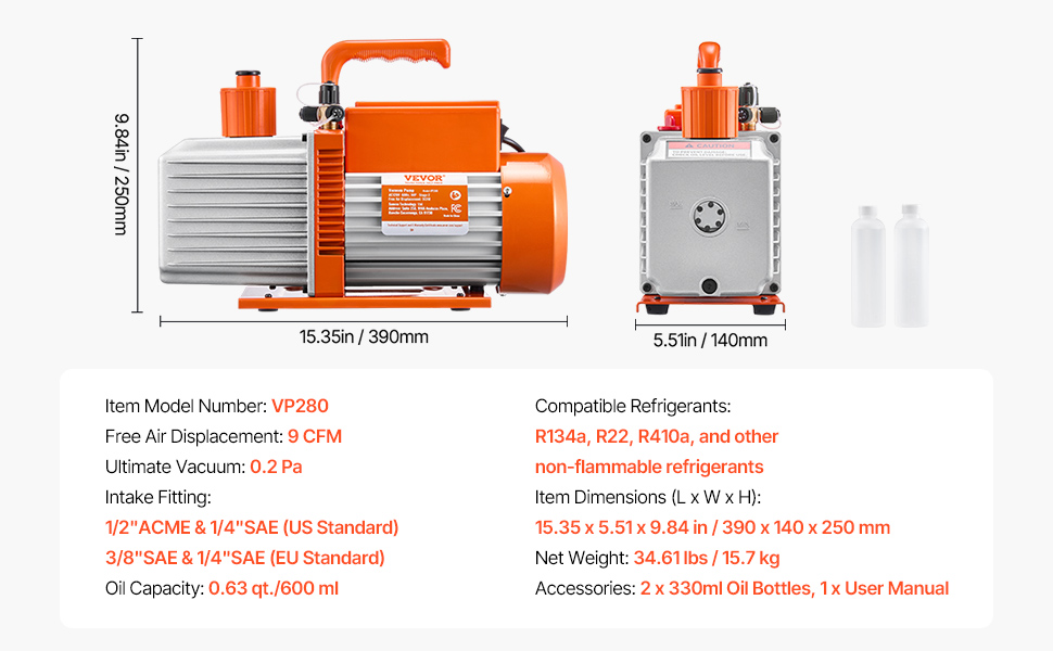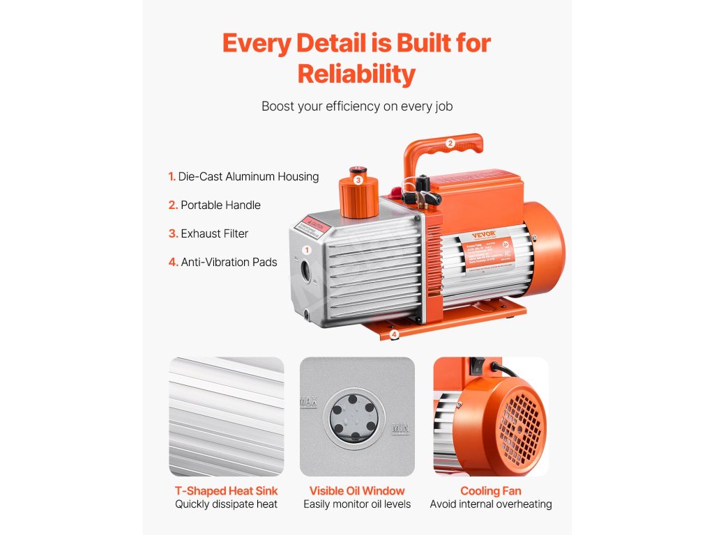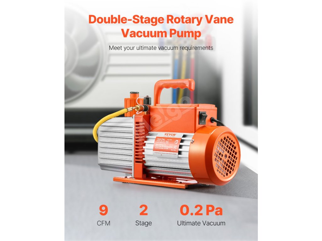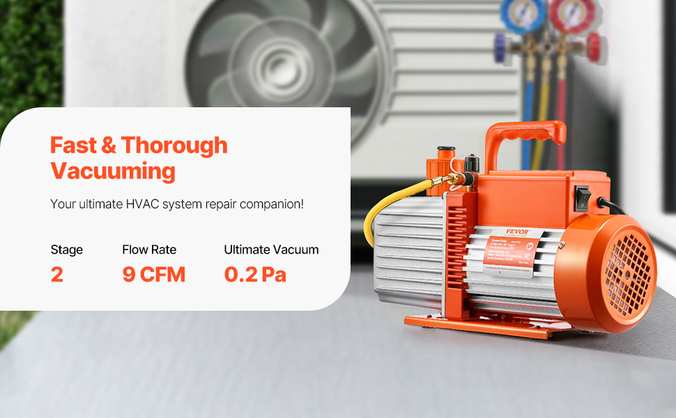 Naša 9CFM vákuová pumpa pre HVAC poskytuje rýchle odsávanie a dosahuje konečný podtlak 5 Pa. Vybavená motorom z čistej medi, 1/4" SAE a 3/8" SAE portami a dvoma fľašami s 0,35 qt vákuového oleja, ľahko opravuje automobilové alebo menšie HVAC systémy, ako sú R22, R134a a R410a.