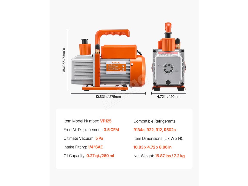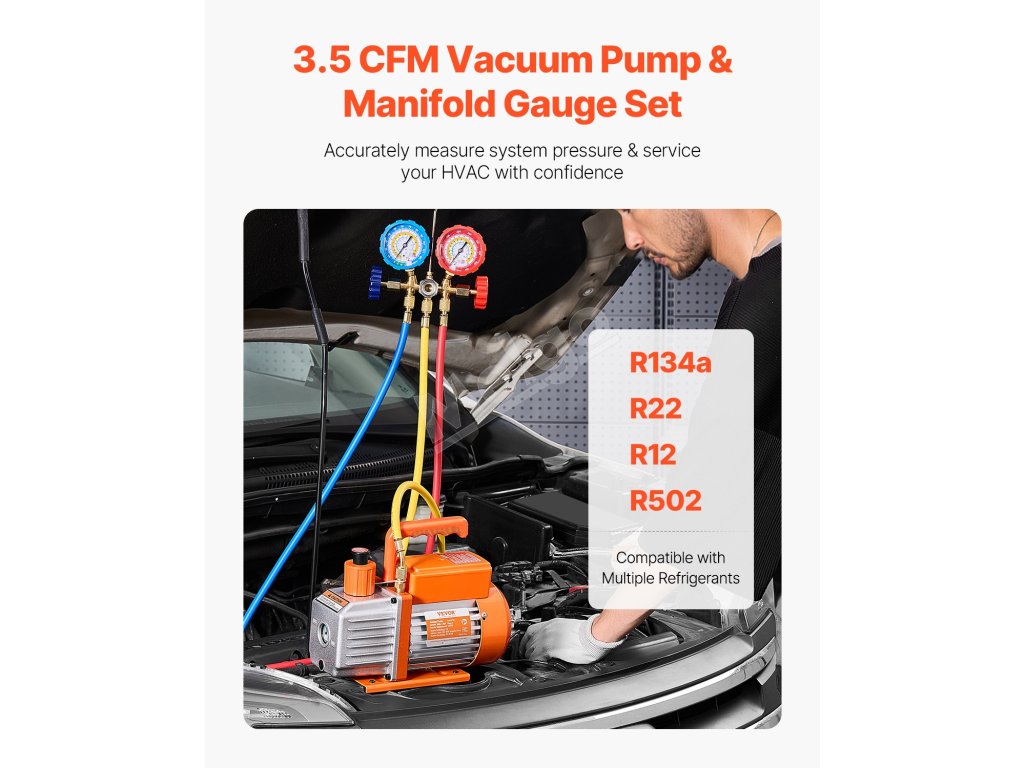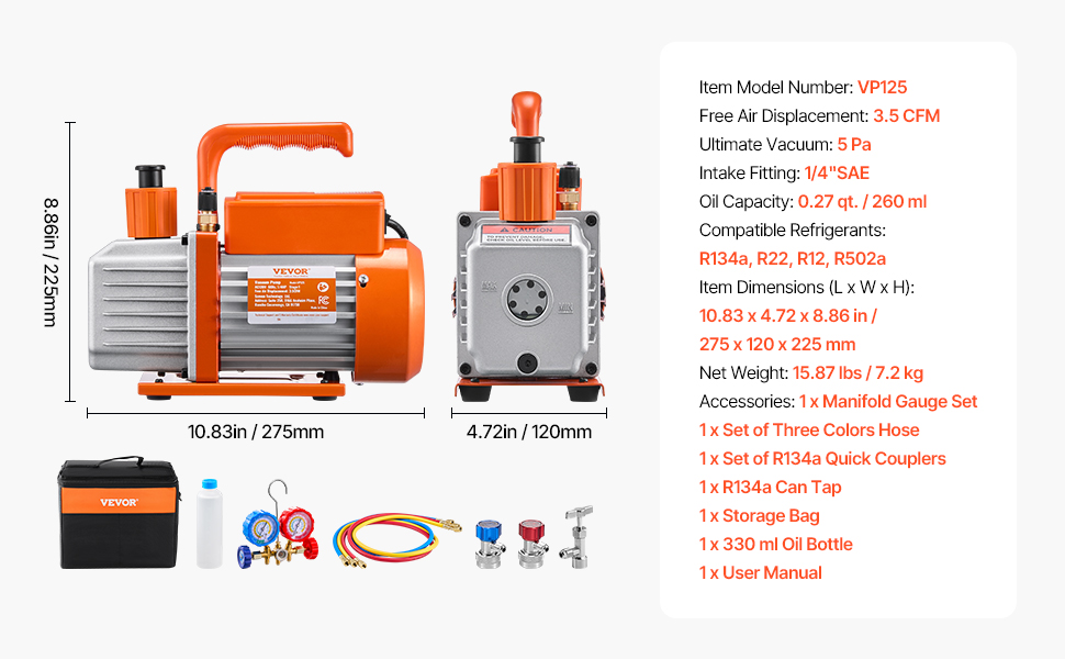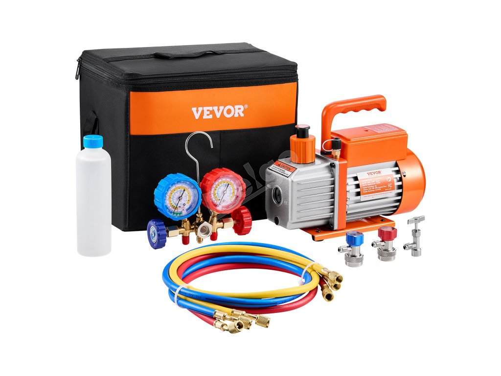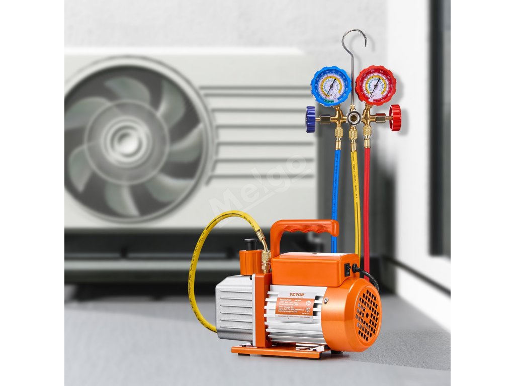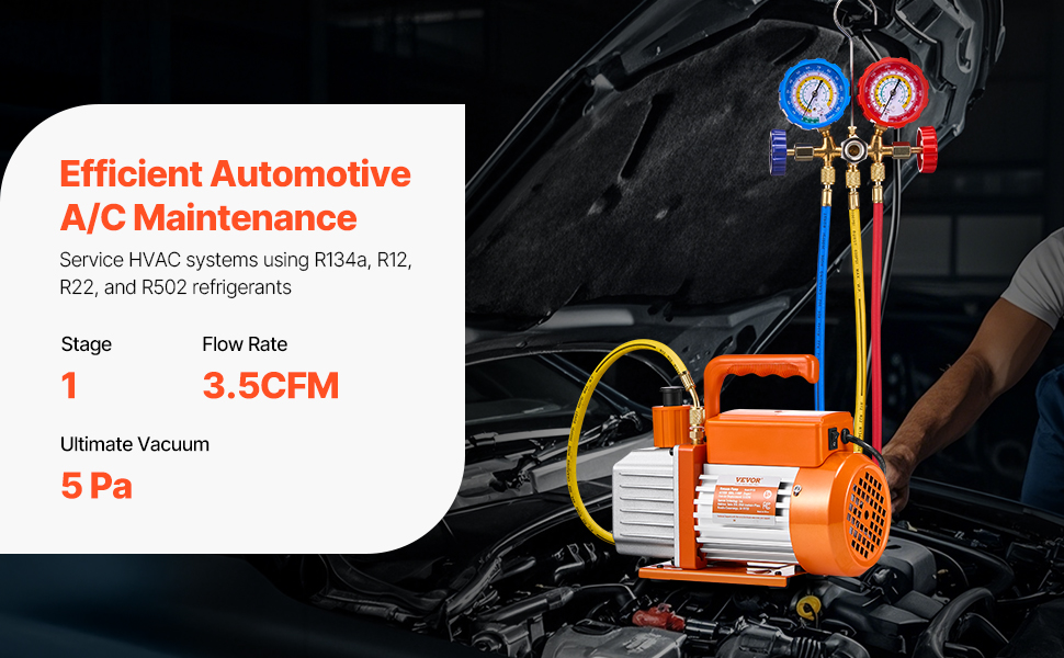 Naša súprava vákuovej pumpy 3,5CFM, ktorá je špeciálne navrhnutá pre profesionálov v oblasti HVAC a domácich majstrov, obsahuje manometer, 3,94 ft trojfarebnú hadicu a sadu rýchlospojok R134a. Vďaka maximálnemu podtlaku 5 Pa a motoru z čistej medi je kompatibilná s chladivami R134a, R22, R12 a R502.