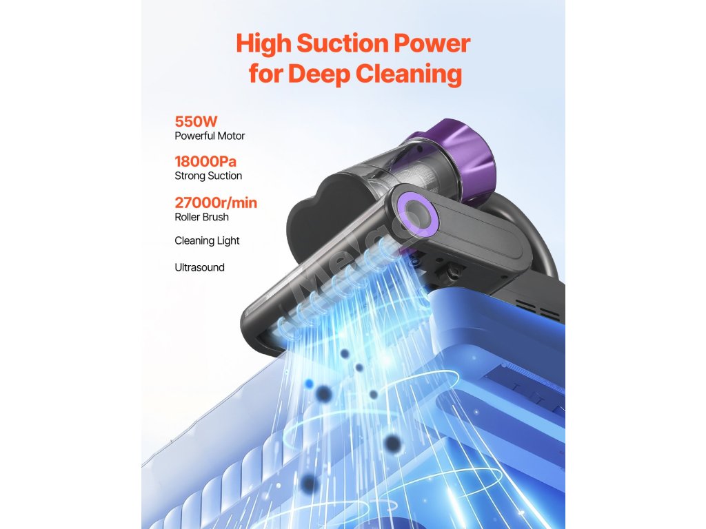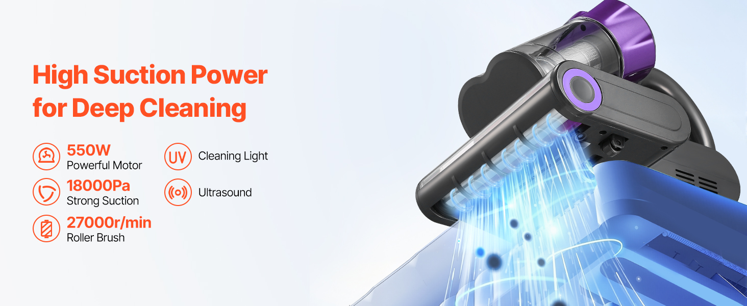 Vďaka saciemu výkonu až 18 Kpa a vysokorýchlostnej valcovej kefe s 27 000 otáčkami za minútu je vybavený čistiacim svetlom a ultrazvukovou technológiou na rýchle preniknutie do tkanín a odstránenie prachu.