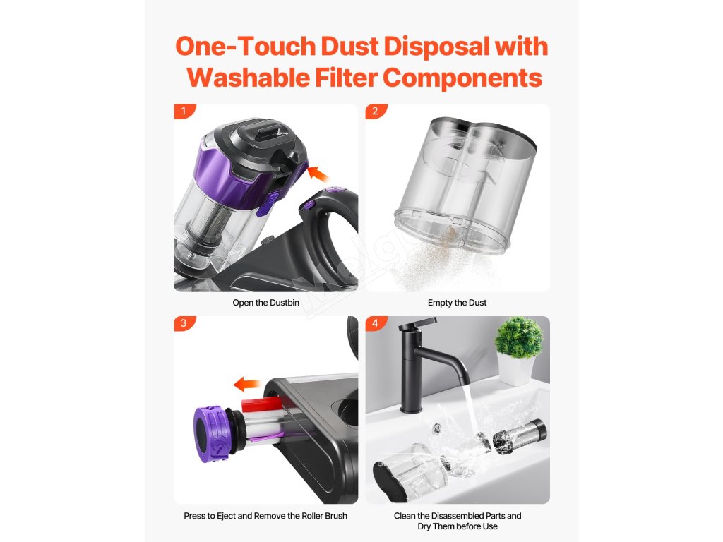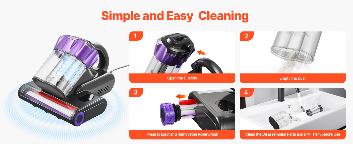 Filter HEPA, zásobník na prach a valčeková kefa sú odnímateľné a umývateľné na jednoduchú údržbu. Po použití sa uistite, že ste ho dôkladne vyčistili a pred opätovným použitím zabezpečte, aby boli všetky časti suché.